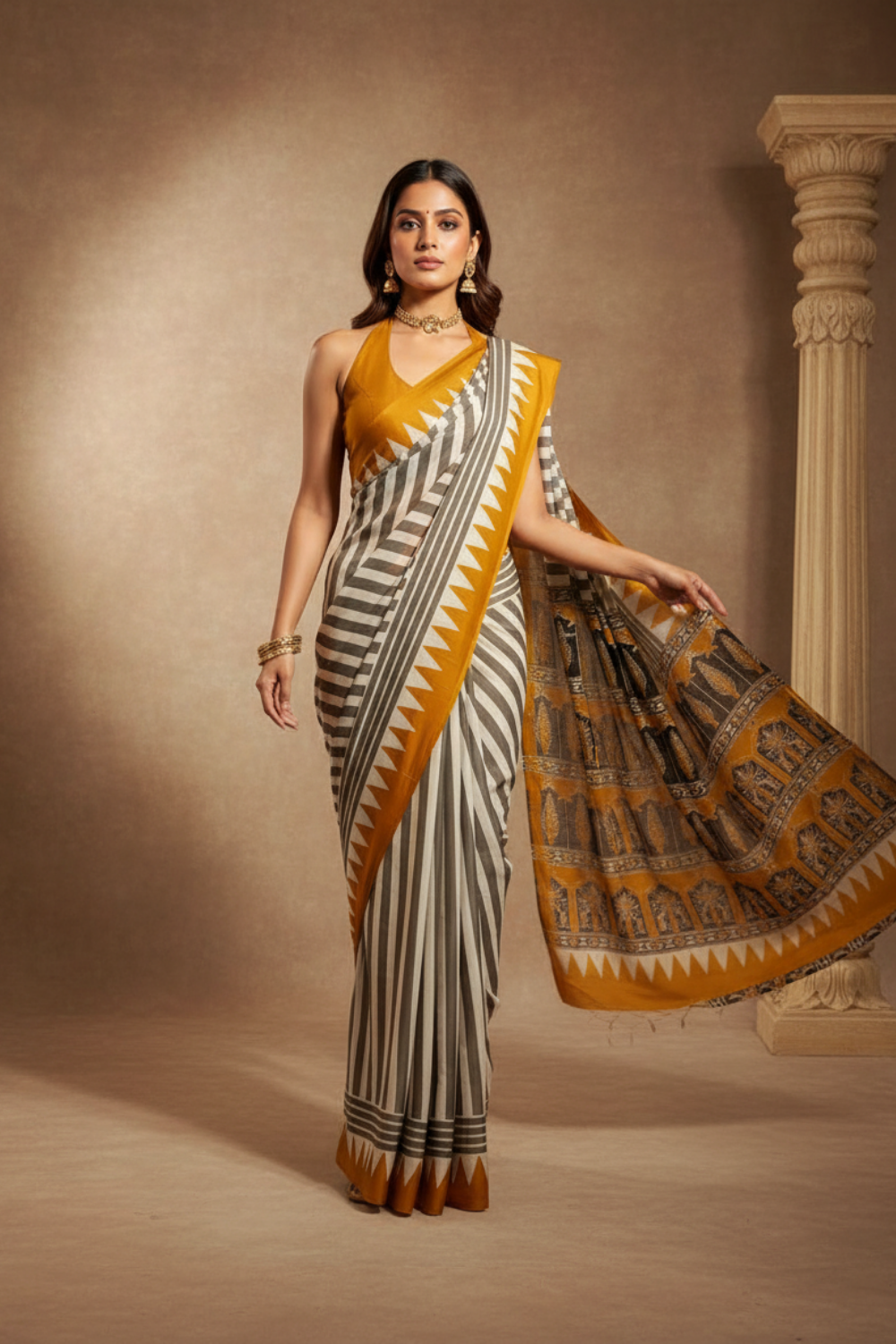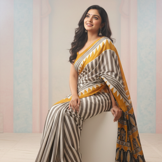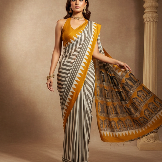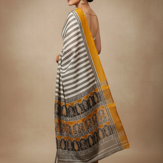 Panna White Mustard Digital Printed Saree With Unstitched Blouse