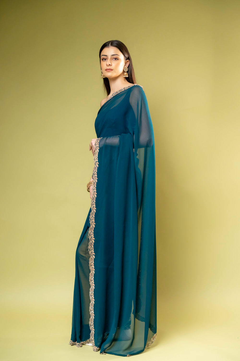 Made from luxurious Georgette, this saree, adorned with Swarovski & Zarkan, suits Formal Occasion. Its Color Variations and design make it an elegant choice. Dry Wash / Dry Clean advised for care.