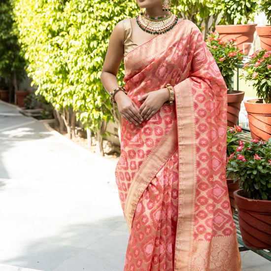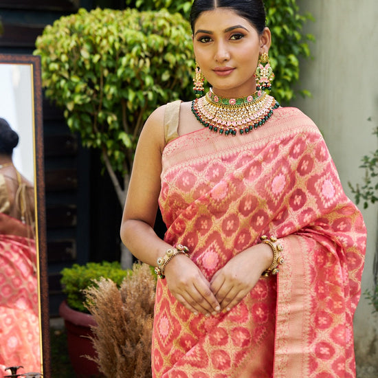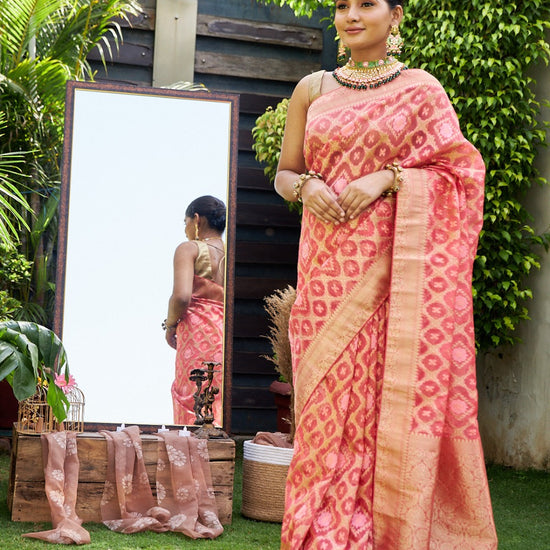 Panna Coral Organza Banarasi Woven Zari Saree With Unstitched Blouse
