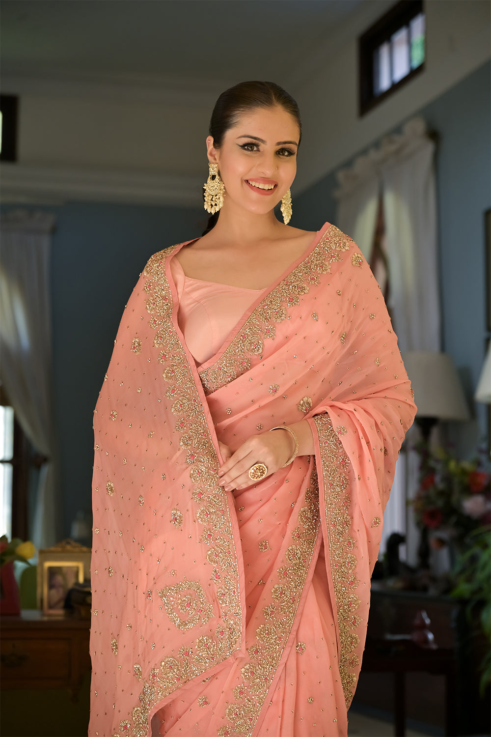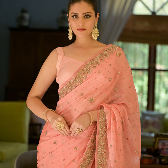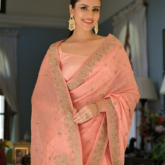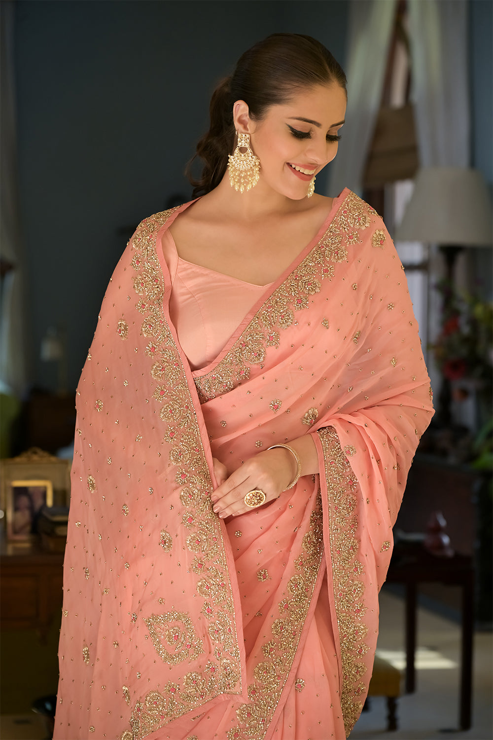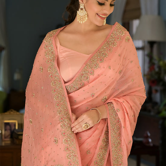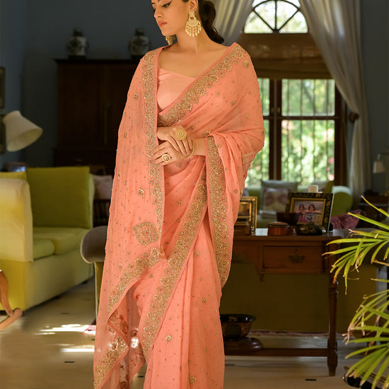Panna Pink Dabka, Threadwork & Zarkan Organza Saree With Unstitched Blouse