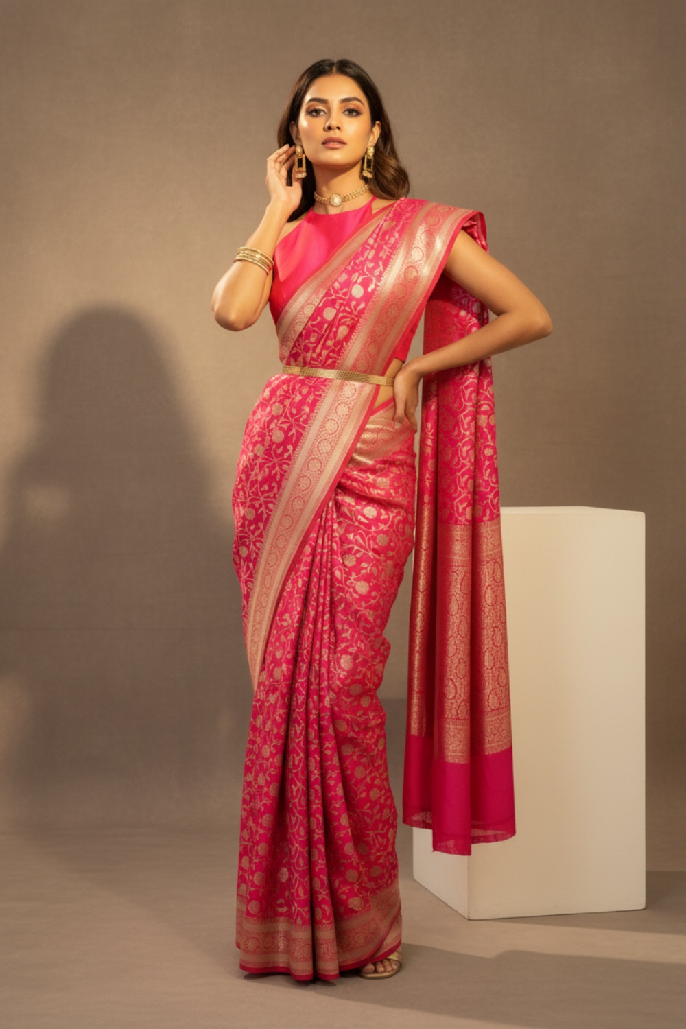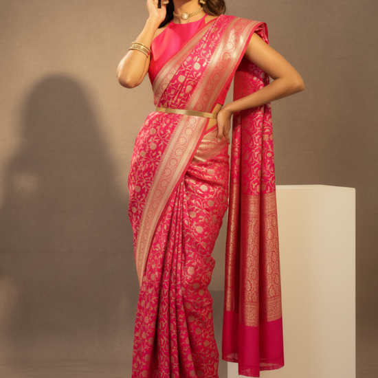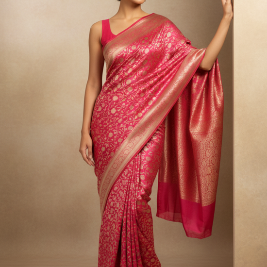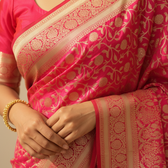 Experience true heritage luxury with this elegant Banarasi silk saree, beautifully crafted with intricate Banarasi woven zari work. The rich silk fabric offers a natural sheen and regal drape, while the detailed zari weaving showcases the timeless artistry and traditional craftsmanship of Banaras. Perfect for weddings, festive occasions, and grand celebrations, this saree embodies classic elegance, cultural richness, and refined sophistication. A masterpiece that adds a touch of royal charm to every moment.