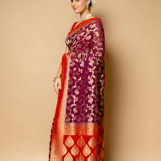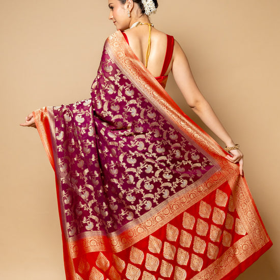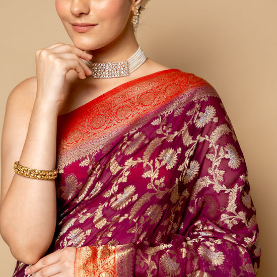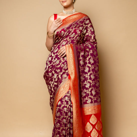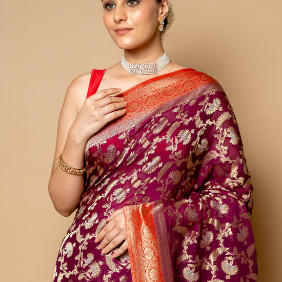 Panna Wine Banarasi Woven Zari Chinon Saree With Unstitched Blouse