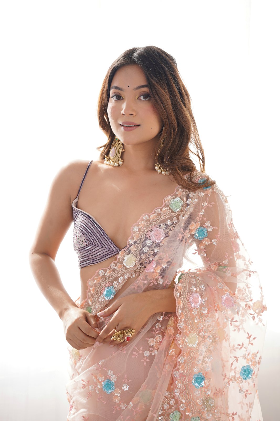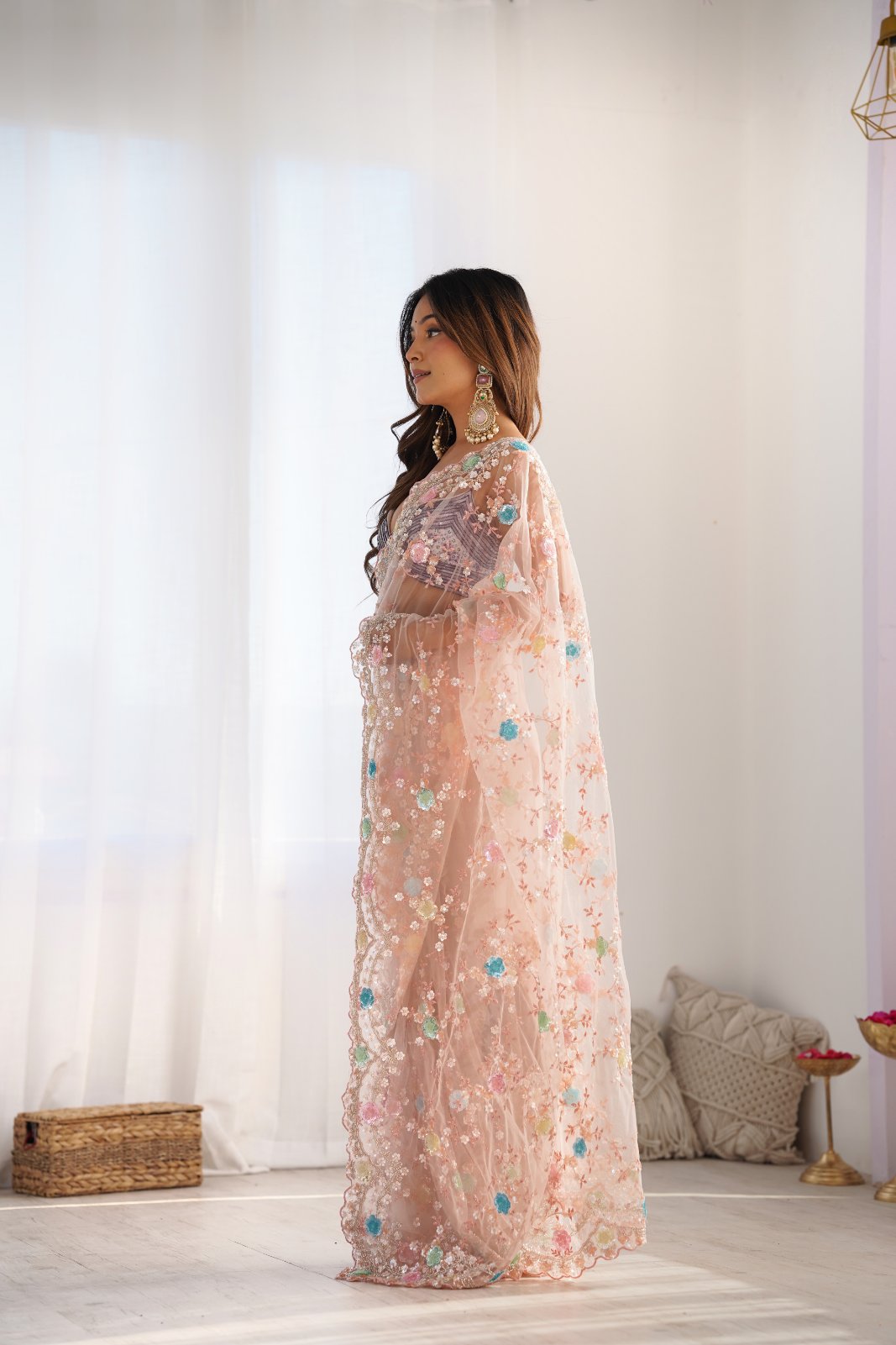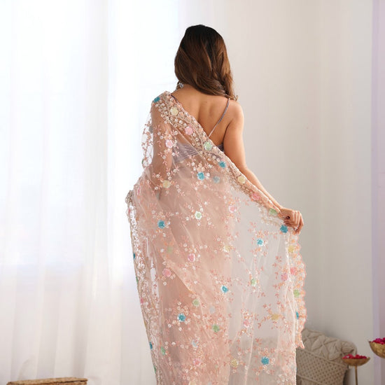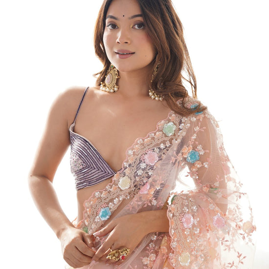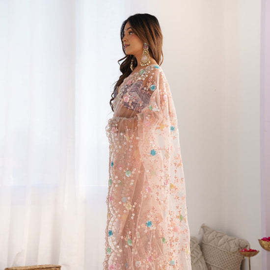 Panna Peach Cutdana, Sequence & Threadwork Net Saree With Unstitched Blouse (Ft:-Arti Chauhan)