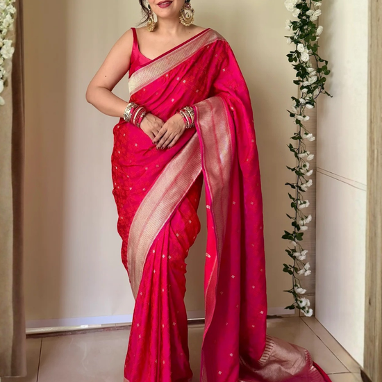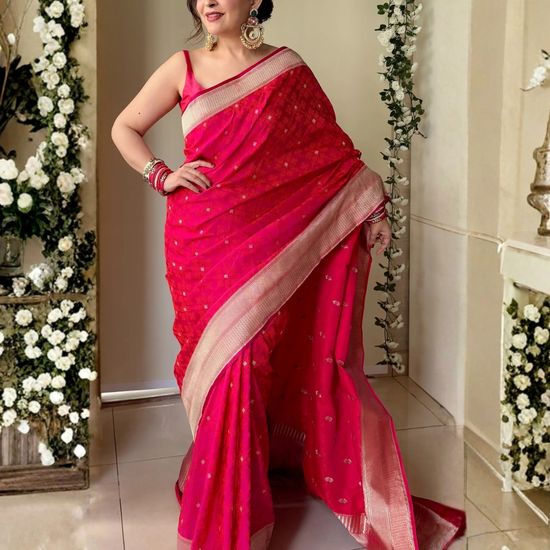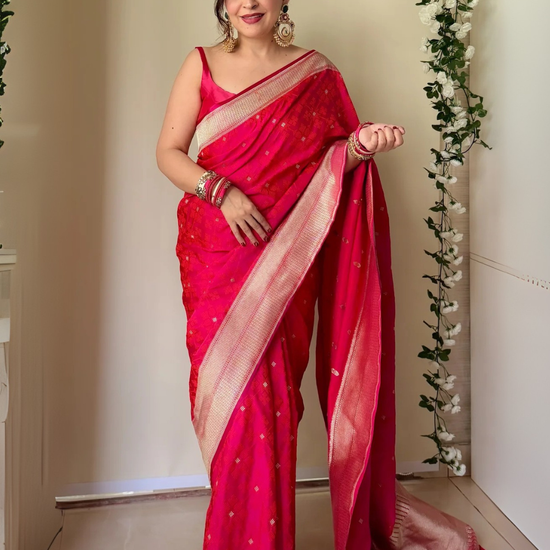 Step into timeless elegance with this exquisite saree that blends traditional artistry with regal charm. Draped in a Vibrant Pink Hue, it features delicate Bandhani-inspired dotted motifs across the body, enhanced by the classic Gharchola design elements. The highlight of the saree is its golden zari border and pallu, which add a royal touch to your festive look. This saree is more than attire—it’s a heritage piece. The vibrant pink with golden zari work ensures you shine