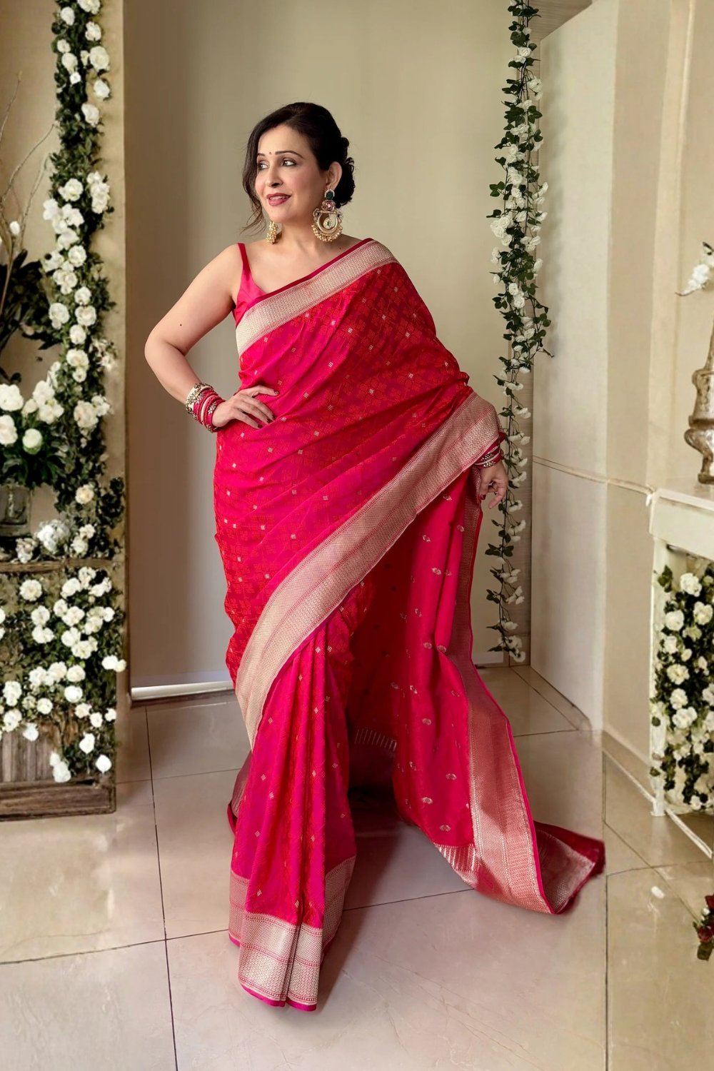 Panna Timeless Elegance Rani Bandhani Gharchola Zari Border Banarasi Silk Saree With Unstitched Blouse (Ft:-Anjan Prasad)