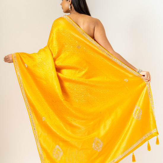 Step into regal splendor with this magnificent Banarasi silk saree, beautifully adorned with intricate Banarasi woven zari work, sparkling Swarovski embellishments, and elegant mirror work. The rich silk fabric exudes a royal sheen, while the detailed zari weaving showcases the timeless artistry of Banaras. The addition of mirror and Swarovski accents lends a touch of contemporary glamour, making it perfect for weddings, festive occasions, and grand celebrations. A stunning blend of traditional craftsmanship and modern sparkle, this saree is designed to make you shine with grace and sophistication.