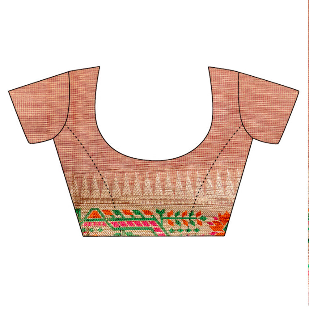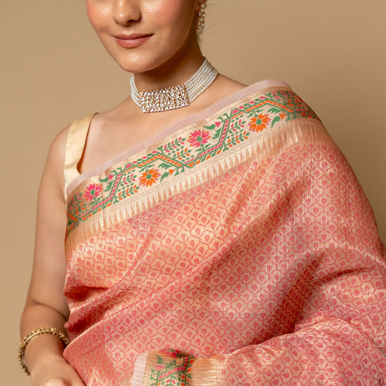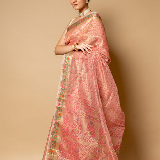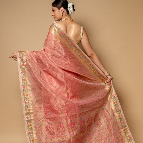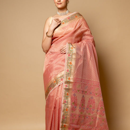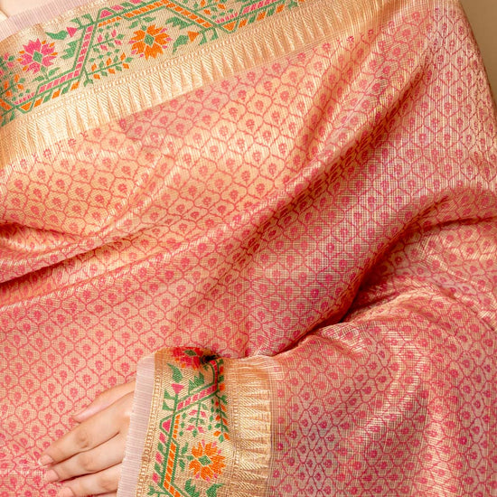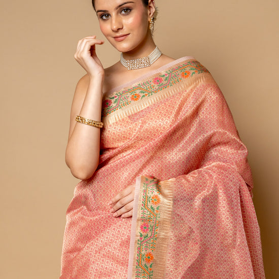 Panna Gajari Banarasi Woven Zari & Digital Printed Cotton Saree With Unstitched Blouse