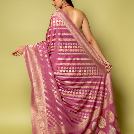 Crafted from Khaddi Georgette, this saree showcases Banarasi Woven Zari, perfect for Party Wear. Its Lightweight design ensures elegance and comfort. Preserve its beauty with Dry Wash / Dry Clean.