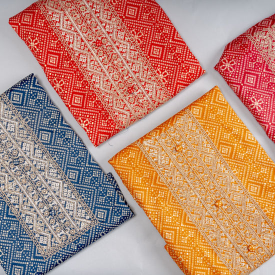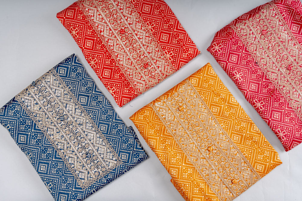 With intricate Bandhini Print, Sequence & Zari Threadwork on luxurious Cotton, this unstitched suit is tailored for Formal Occasion. The Color Variations make it versatile. Keep it flawless with Dry Wash / Dry Clean.