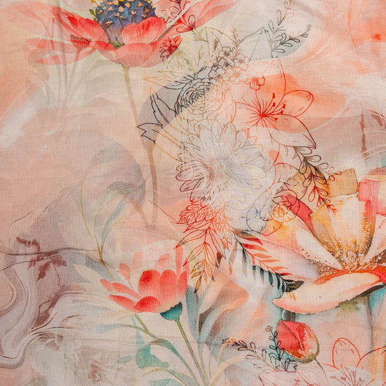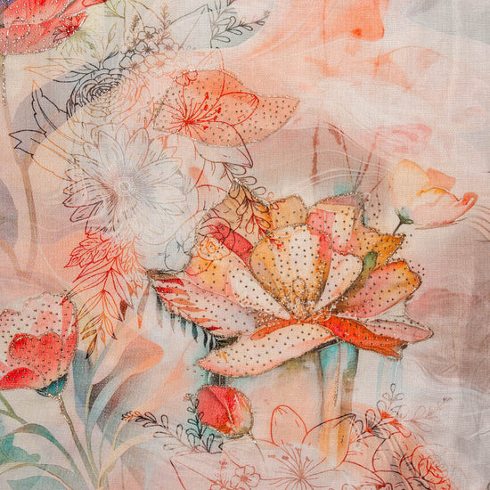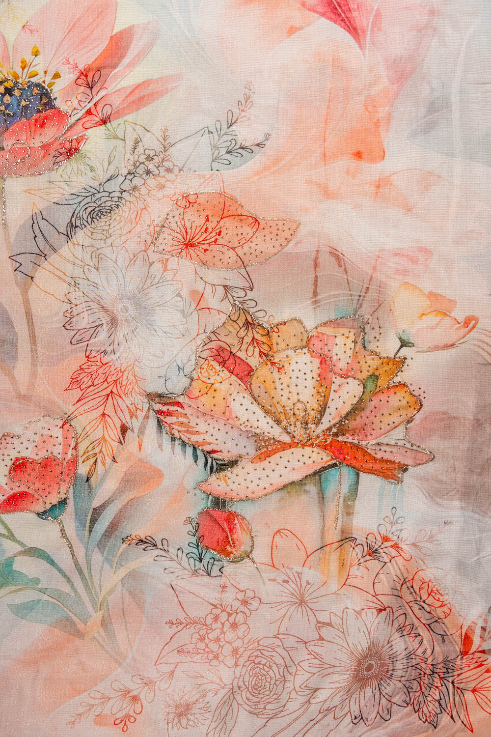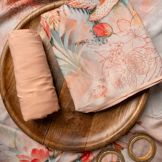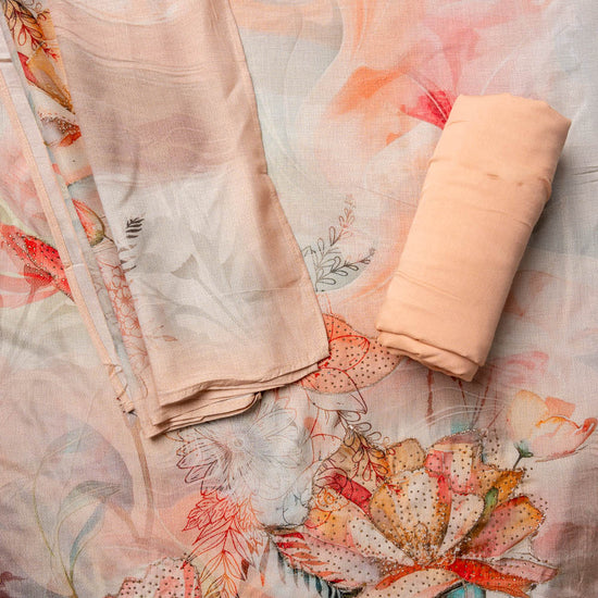 Panna Peach Swarovski, Zari Threadwork, Digital & Floral Printed Chinon Unstitched Salwar Suit With Chinon Dupatta