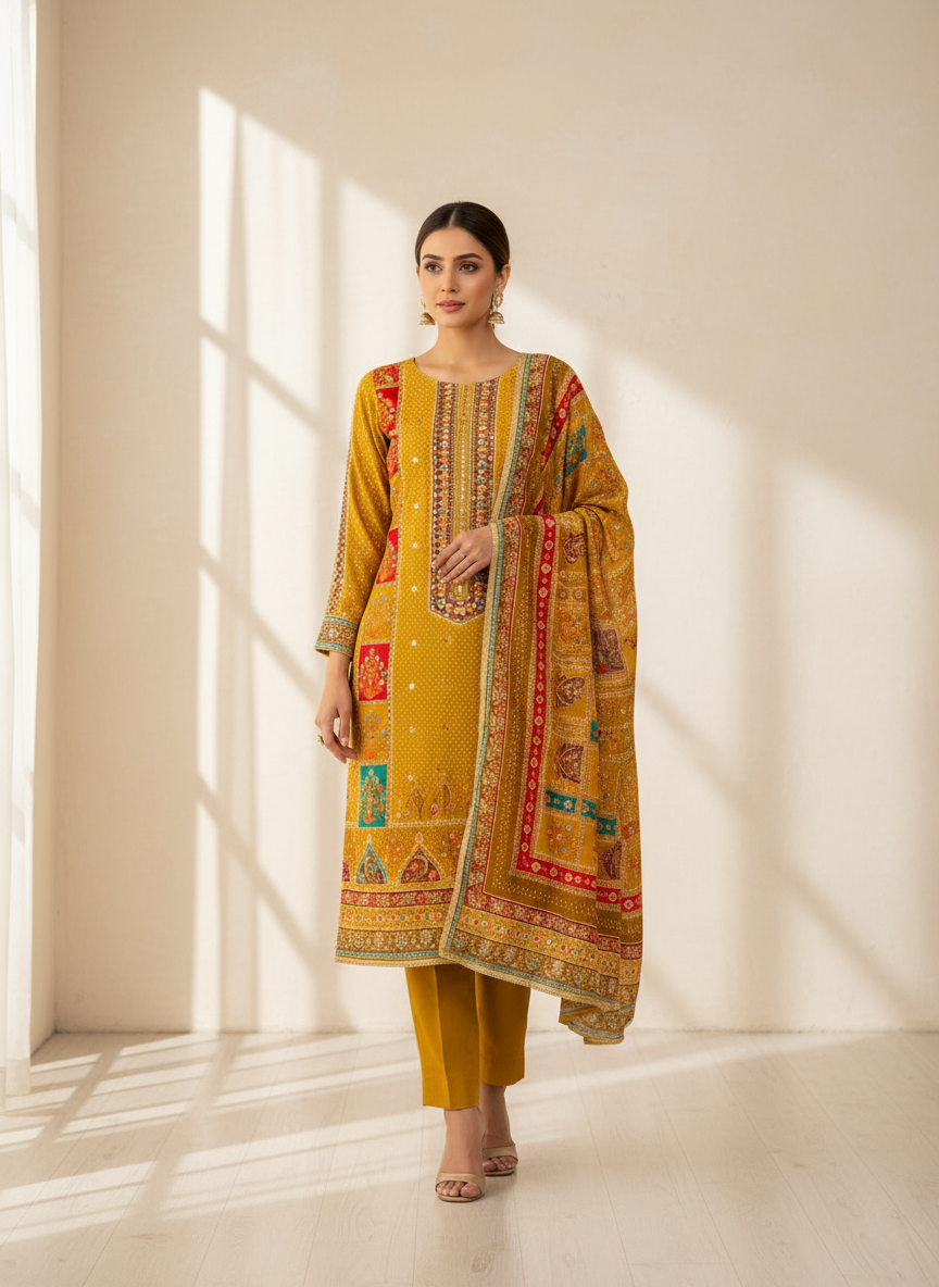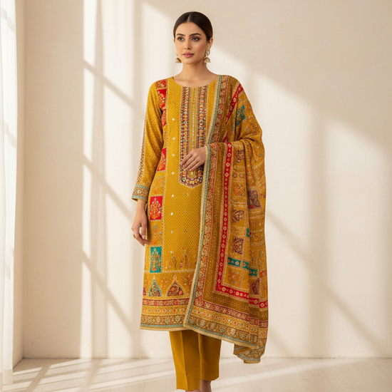 Redefine elegance with this stunning Crepe Unstitched Suit Set, crafted to bring together timeless tradition and contemporary charm. The soft, flowy crepe fabric offers a refined drape and effortless comfort, making it perfect for festive and occasion wear.