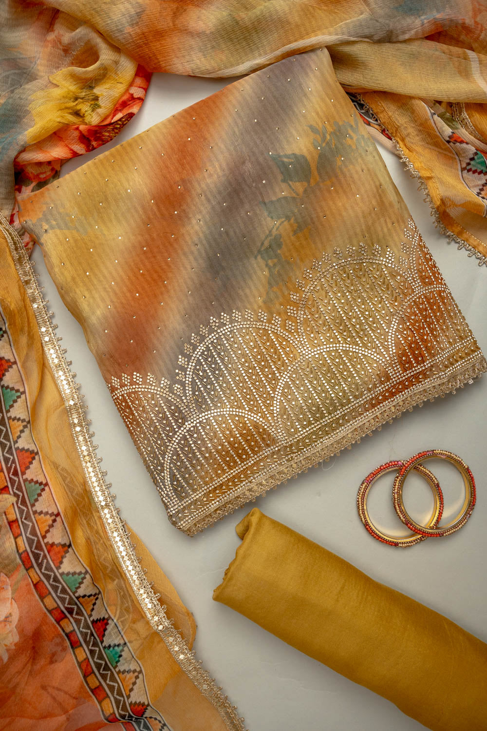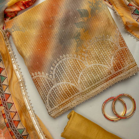 Step into sheer elegance with this exquisite Organza Unstitched Suit Set, a perfect blend of luxury and craftsmanship. Crafted from premium organza fabric, it exudes a soft sheen and graceful flow,