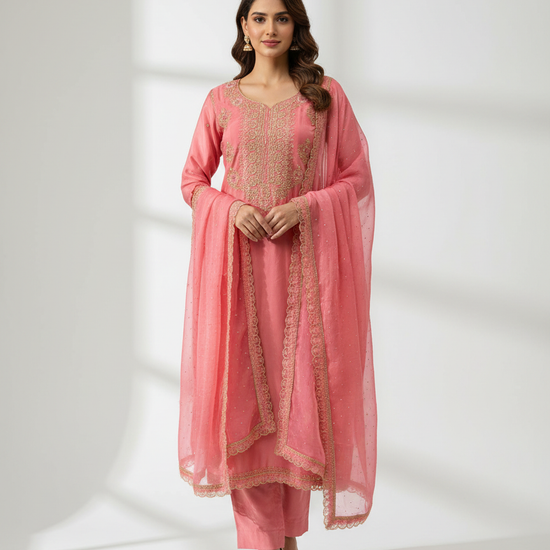 Redefine elegance with this stunning Crepe Unstitched Suit Set, crafted to bring together timeless tradition and contemporary charm. The soft, flowy crepe fabric offers a refined drape and effortless comfort, making it perfect for festive and occasion wear.