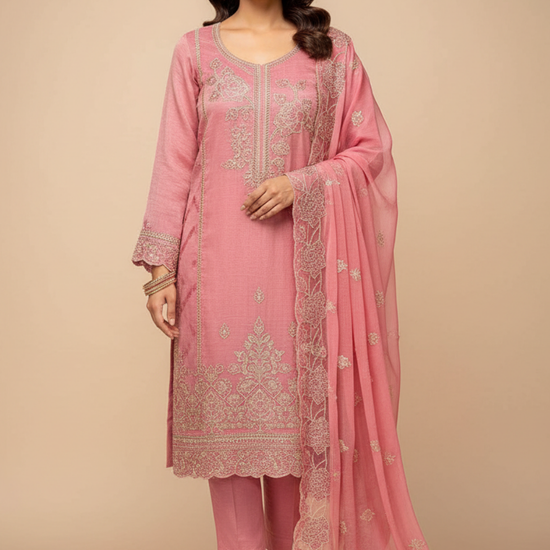Highlighted by intricate Sequence, Zarkan & Zari Threadwork, this unstitched suit is crafted from Organza for Formal occasions. Color Variations enhance its appeal. Maintain with Dry Wash / Dry Clean.