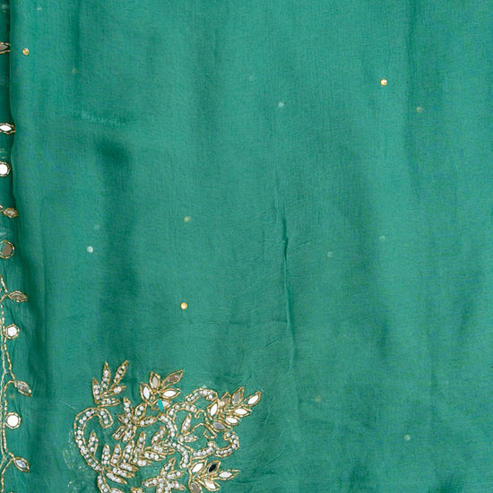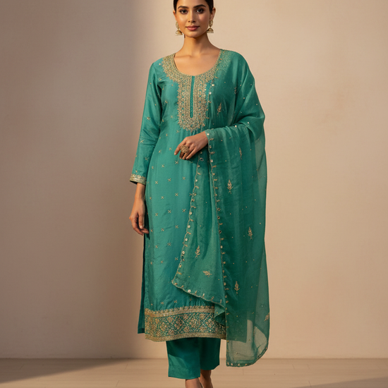 Adorned with sparkling bead accents, handcrafted cutdana embroidery, gleaming mirror embellishments, and shimmering sequin and zarkan work, this ensemble captures the perfect balance between tradition and contemporary sparkle. Each detail is thoughtfully placed to create a graceful yet dazzling statement.