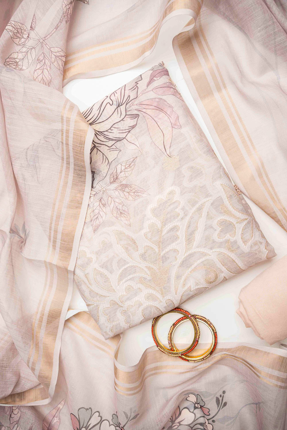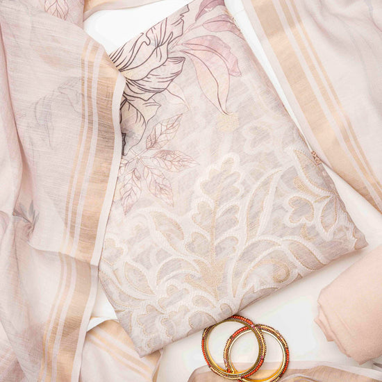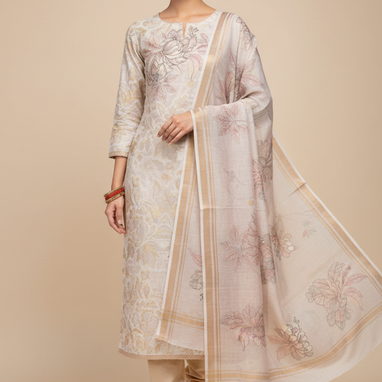 Made from Cotton, this suit with Banarasi Woven Zari & Floral Print combines elegance with ease for Informal Occasion. Its Color Variations and tailoring options make it a wardrobe staple. Dry Wash / Dry Clean advised.