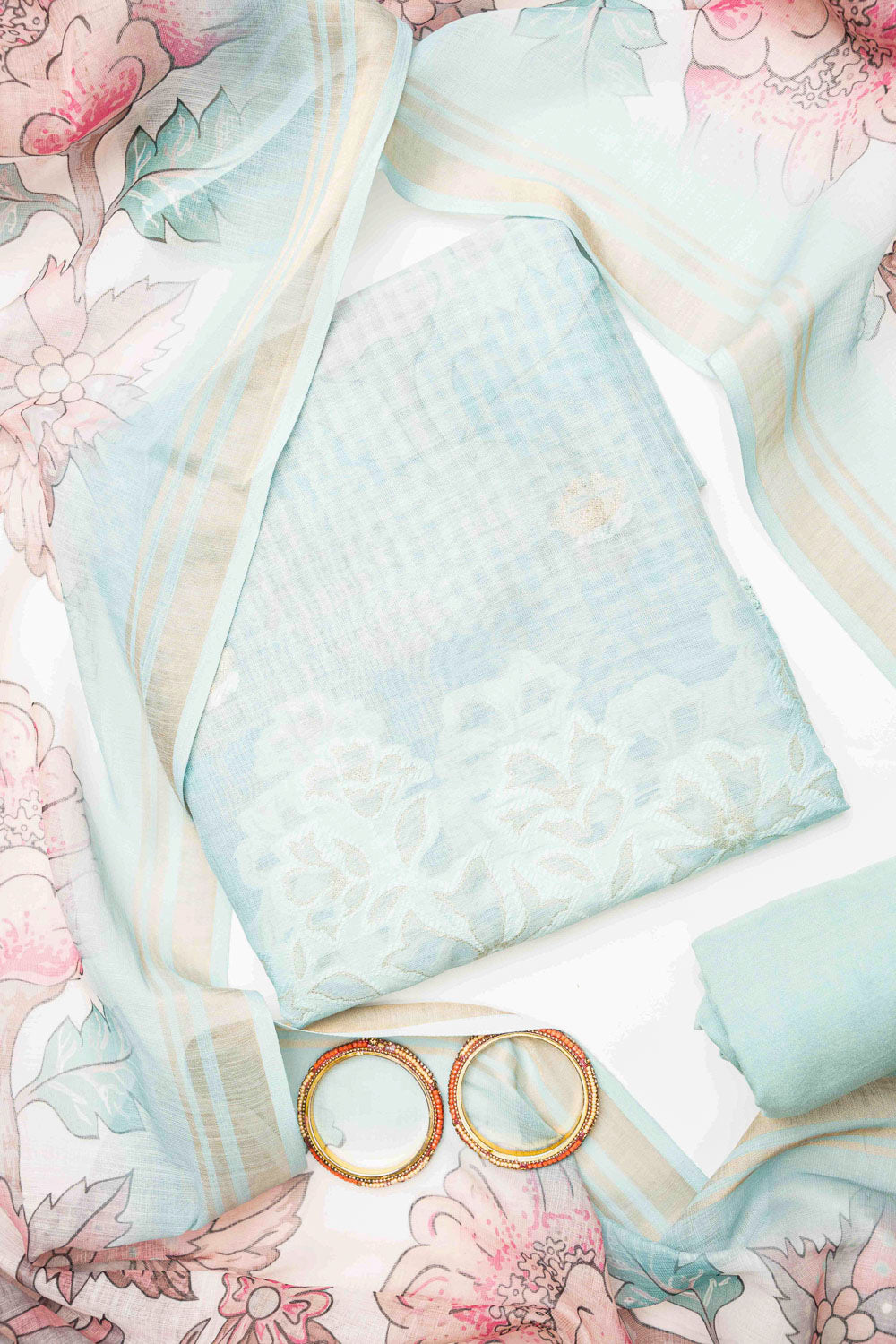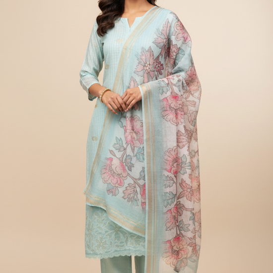 Made from Cotton, this suit with Banarasi Woven Zari & Floral Print combines elegance with ease for Informal Occasion. Its Color Variations and tailoring options make it a wardrobe staple. Dry Wash / Dry Clean advised.