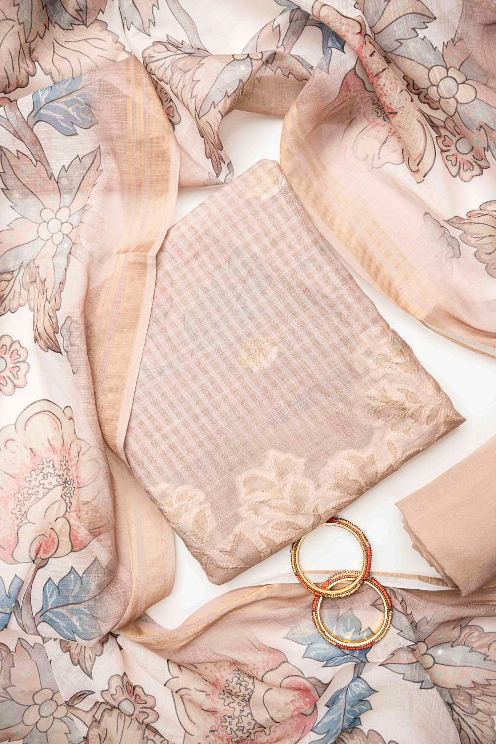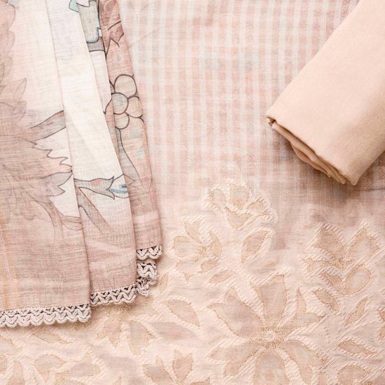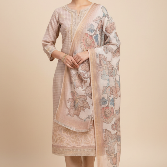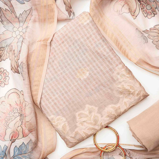 Made from Cotton, this suit with Banarasi Woven Zari & Floral Print combines elegance with ease for Informal Occasion. Its Color Variations and tailoring options make it a wardrobe staple. Dry Wash / Dry Clean advised.