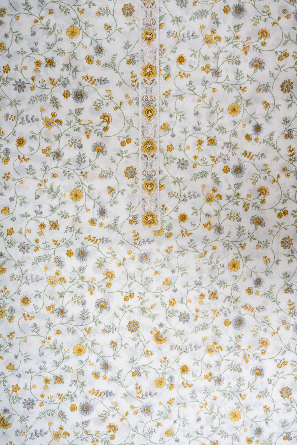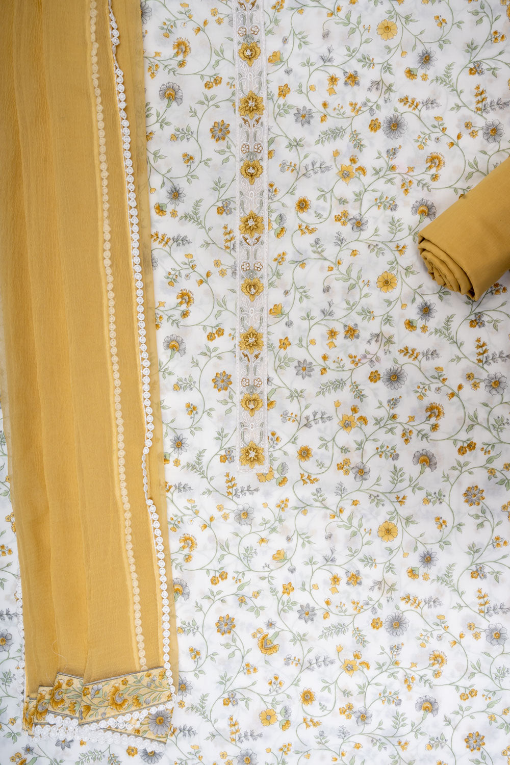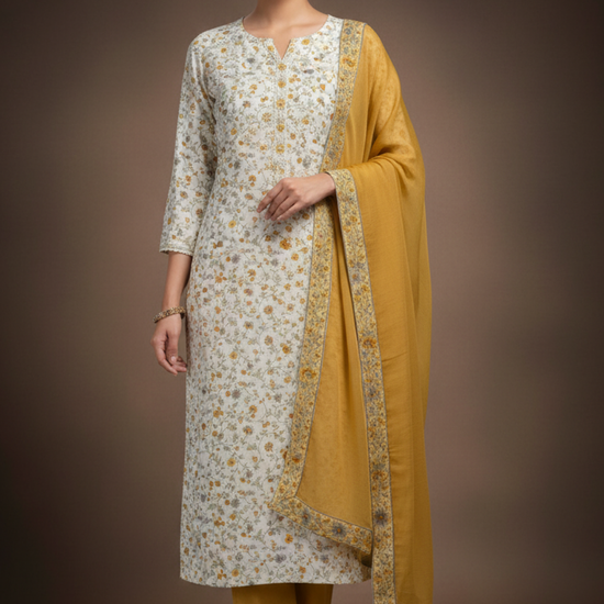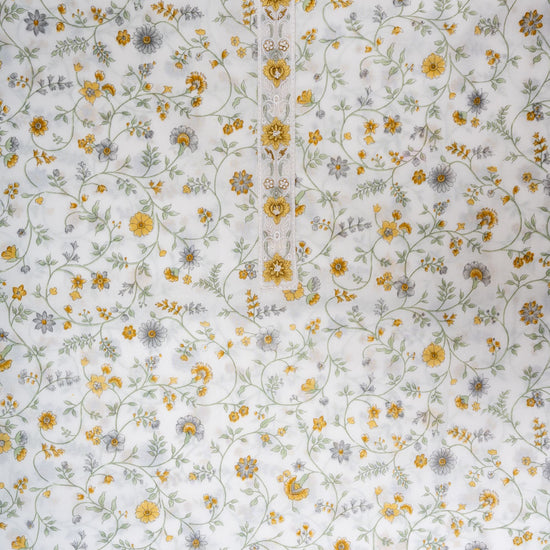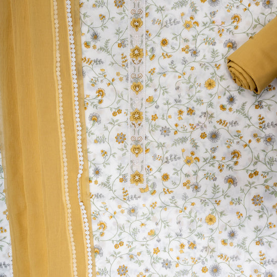Panna Off White Mango Gold Cotton Unstitched Salwar Suit With Chiffon Dupatta