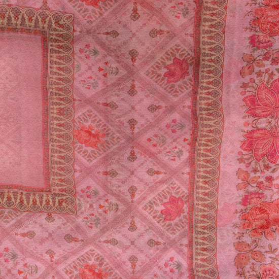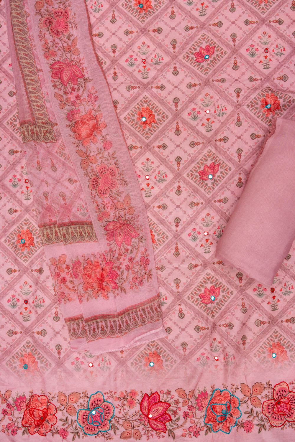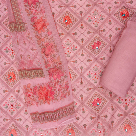 Panna Pink Mirror Sheet, Threadwork & Floral Printed Cotton Unstitched Salwar Suit With Chiffon Dupatta