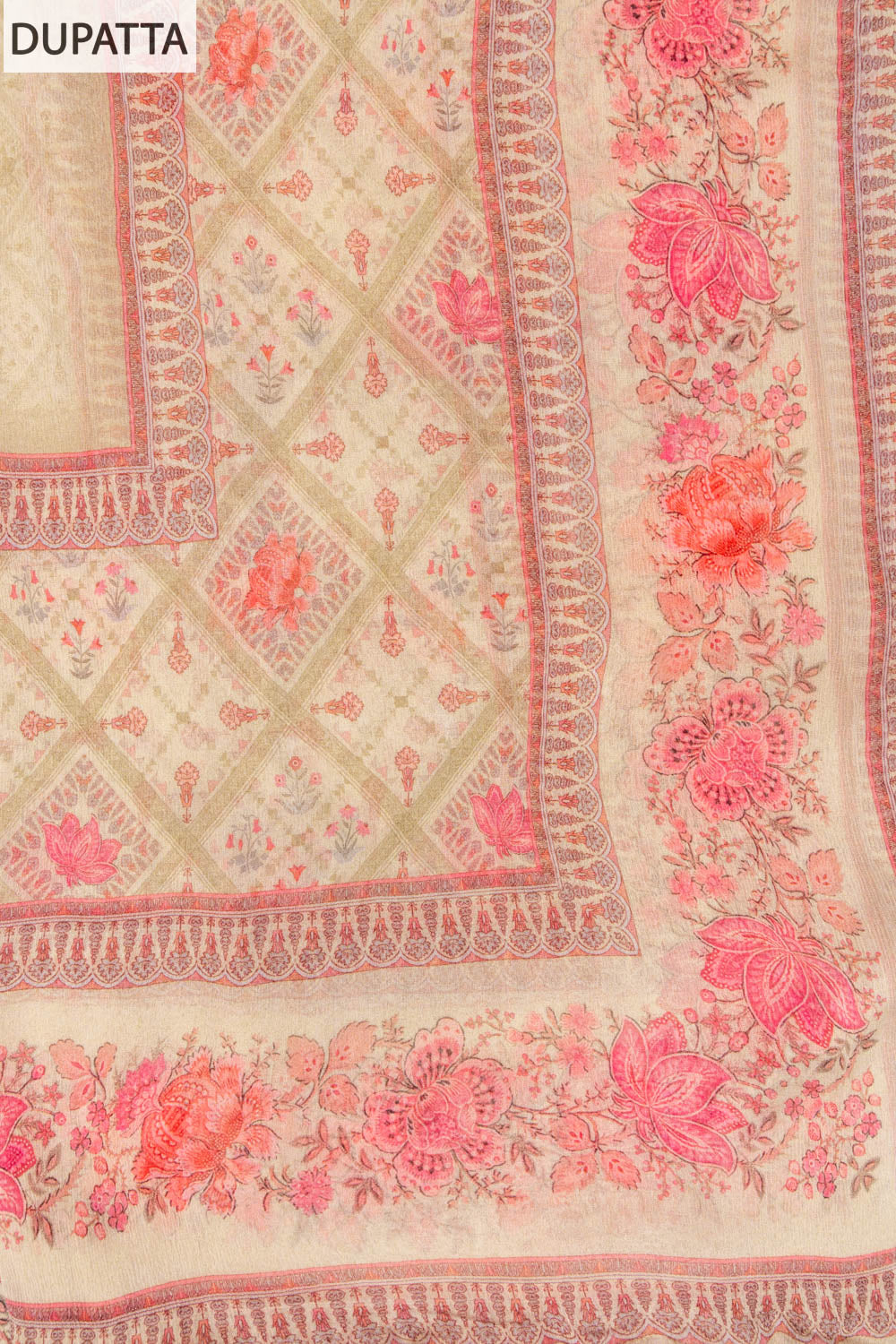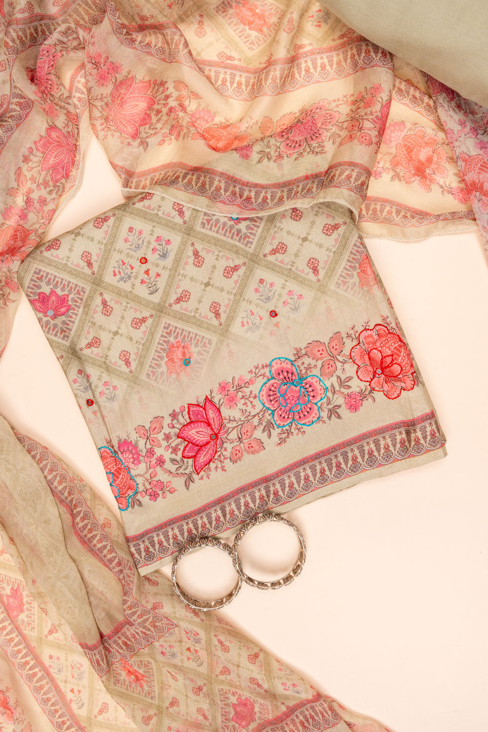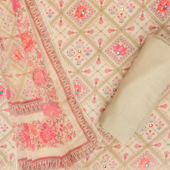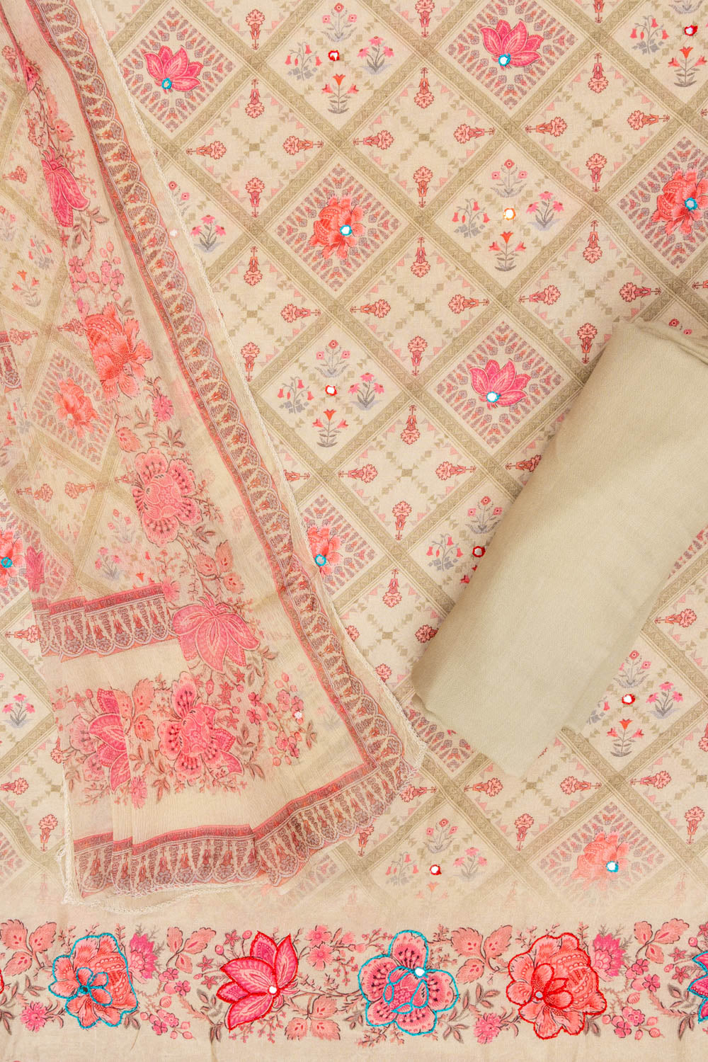 Panna Pista Mirror Sheet, Threadwork & Floral Printed Cotton Unstitched Salwar Suit With Chiffon Dupatta