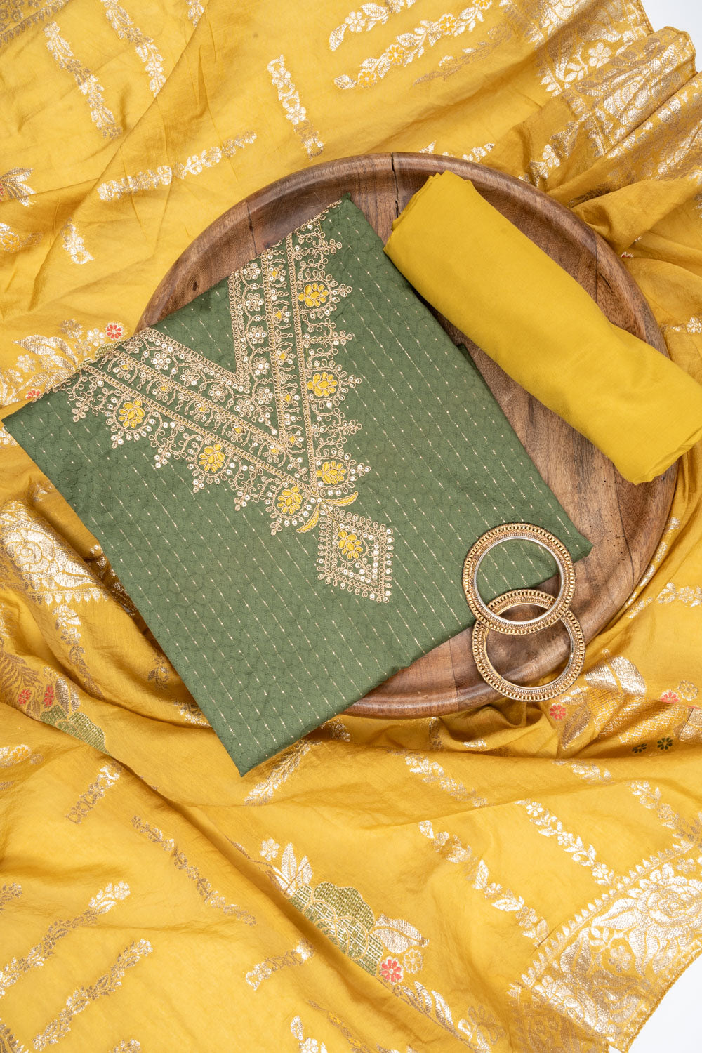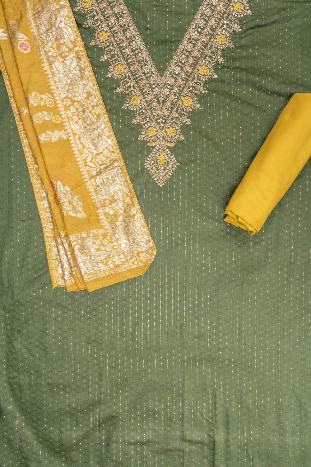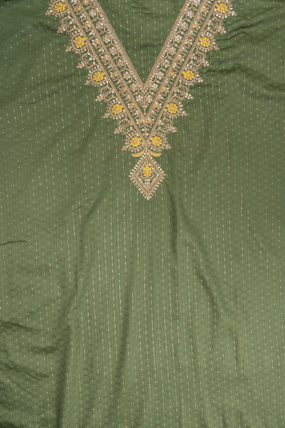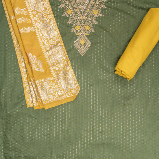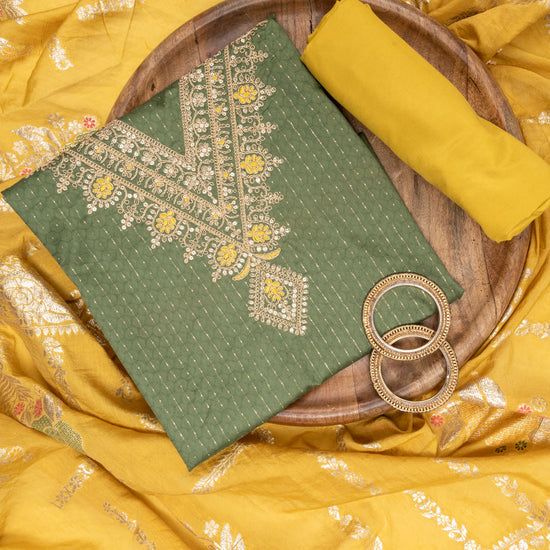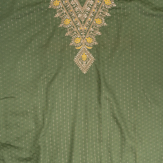Panna Olive Sequence & Zari Threadwork Cotton Unstitched Salwar Suit With Cotton Dupatta