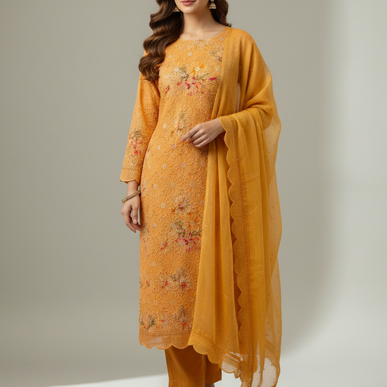 Step into sheer elegance with this exquisite Organza Unstitched Suit Set, a perfect blend of luxury and craftsmanship. Crafted from premium organza fabric, it exudes a soft sheen and graceful flow,