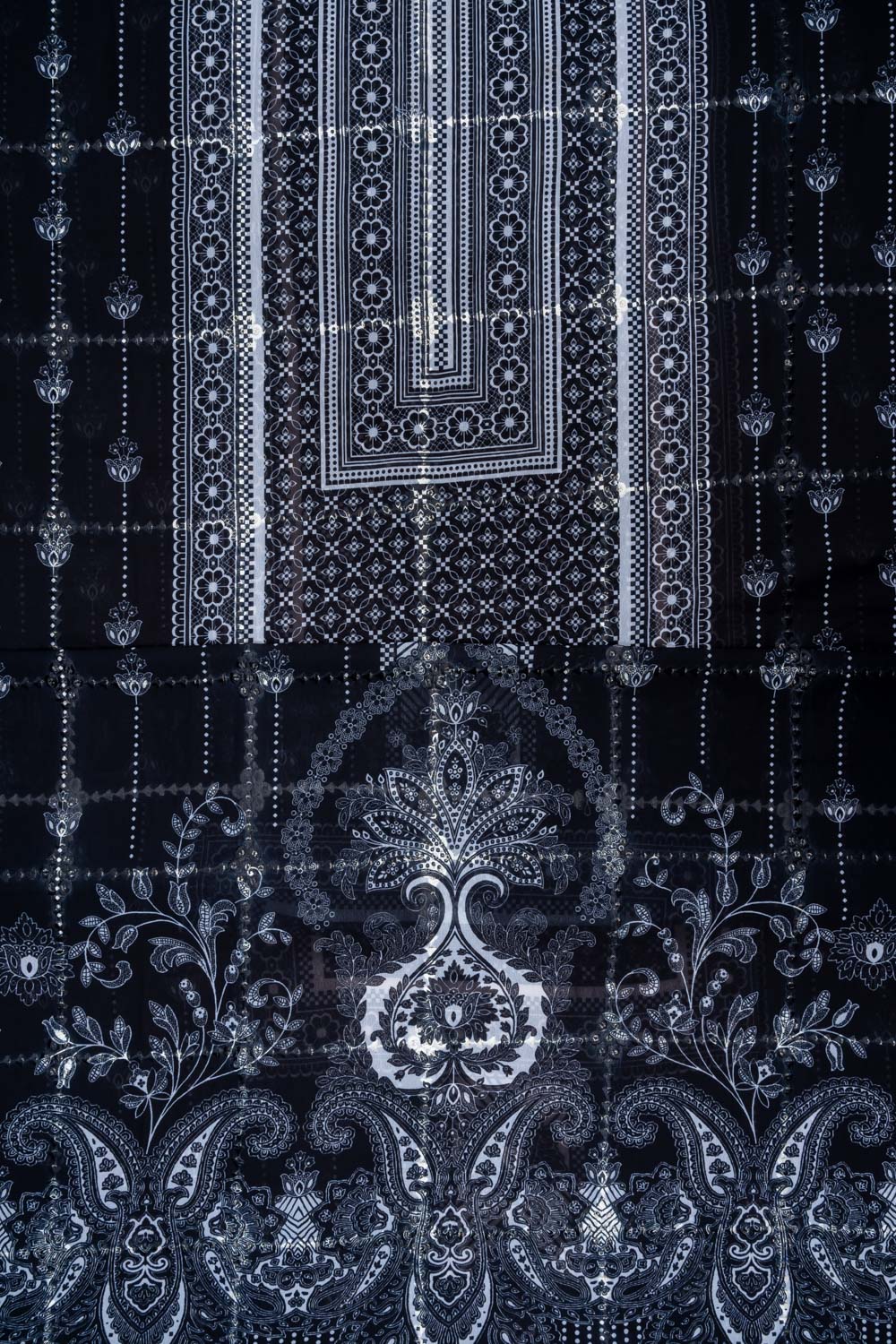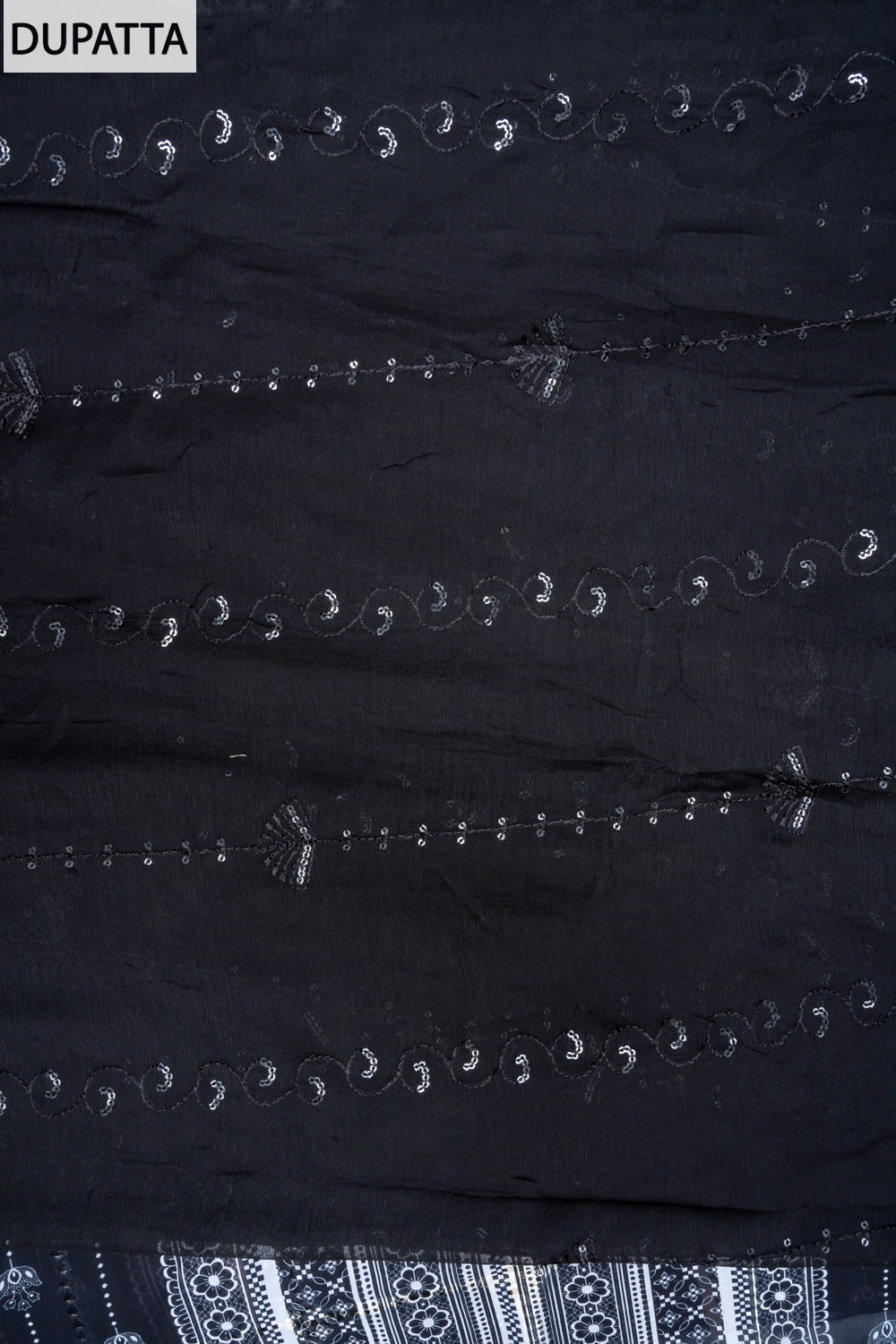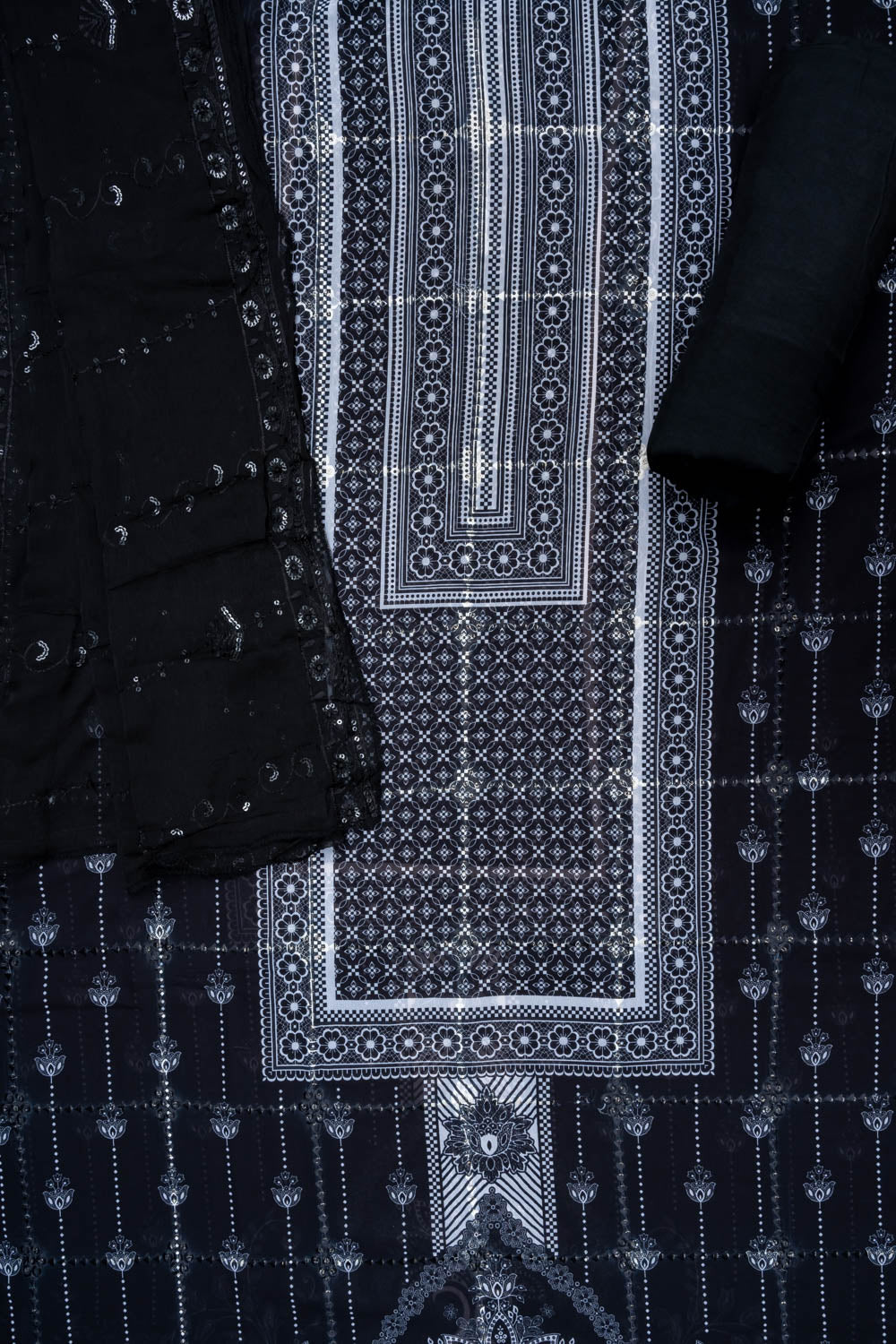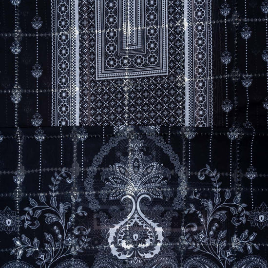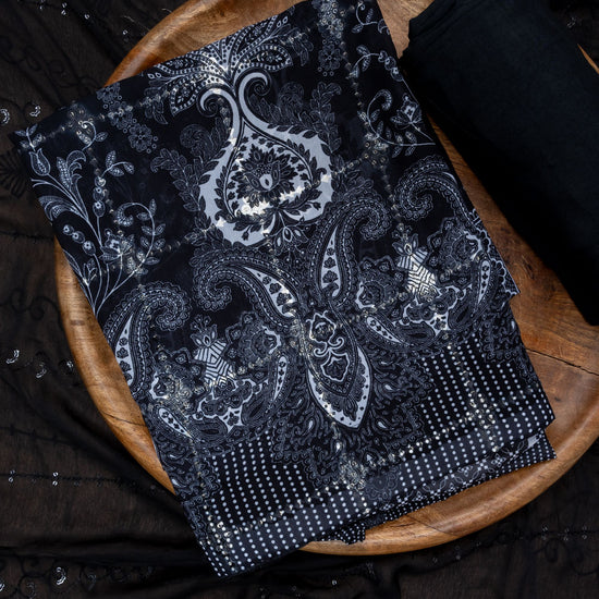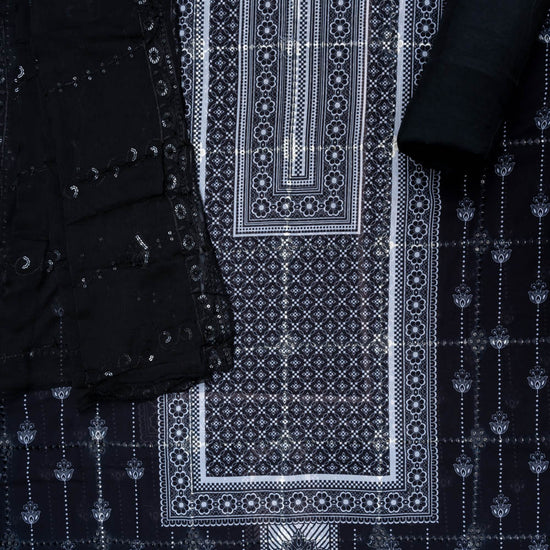 Panna Black Sequence, Threadwork & Digital Printed Cotton Unstitched Salwar Suit With Chiffon Dupatta