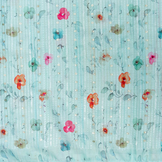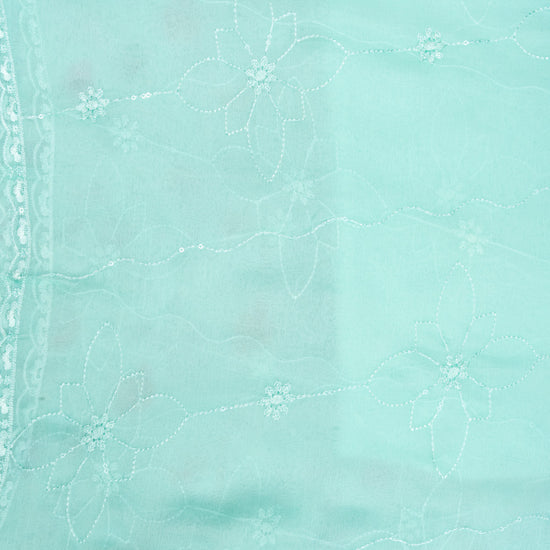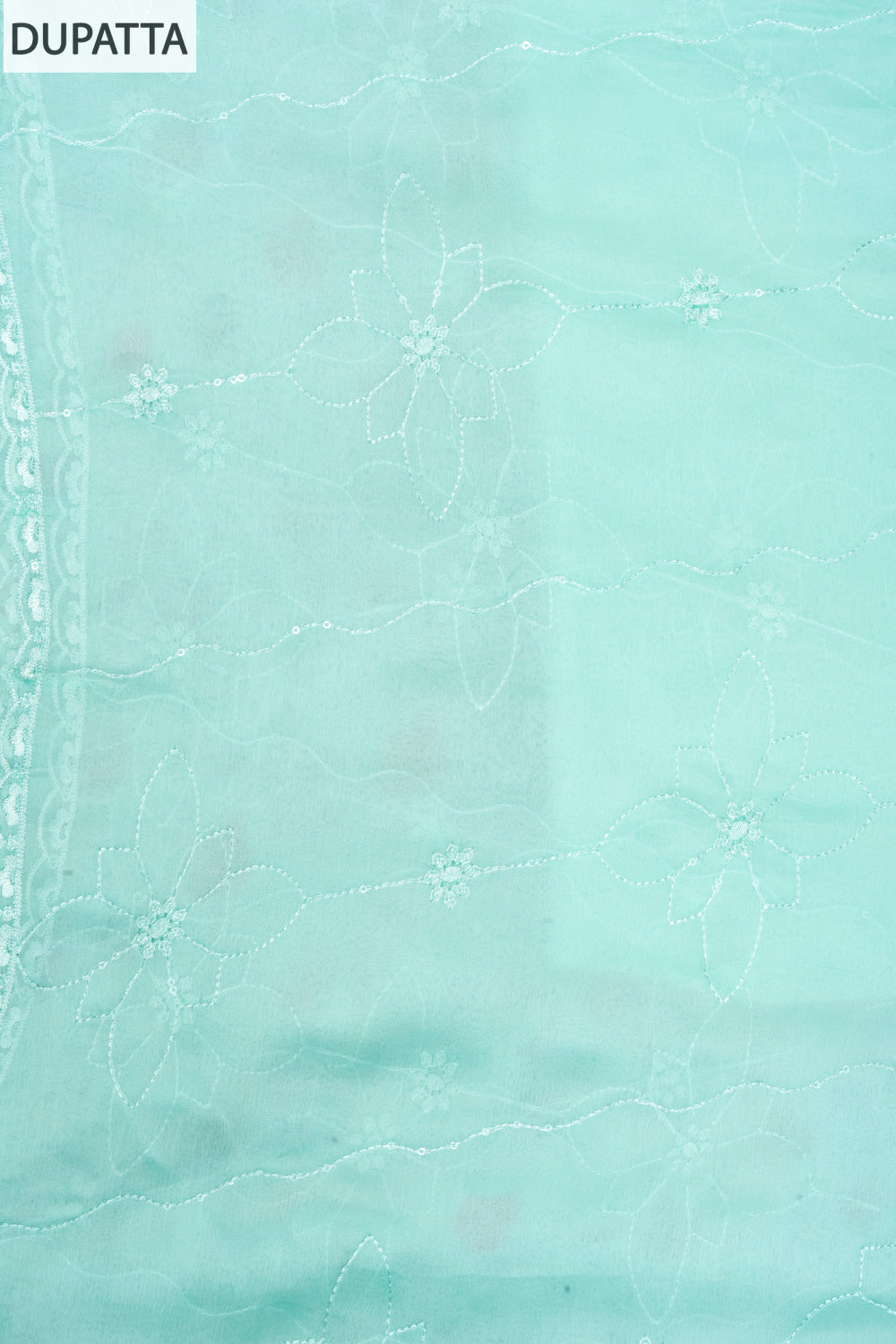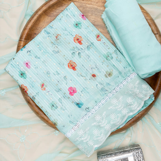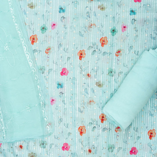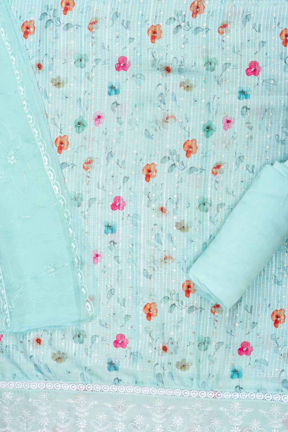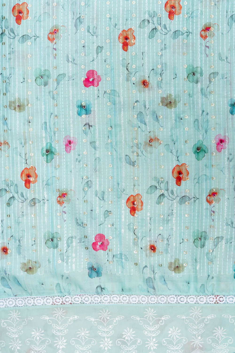 Panna Sea Green Sequence, Threadwork & Floral Printed Cotton Unstitched Salwar Suit With Chiffon Dupatta