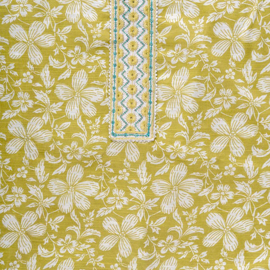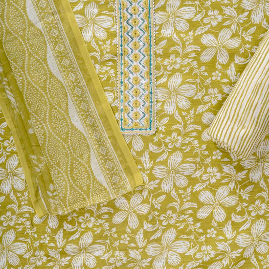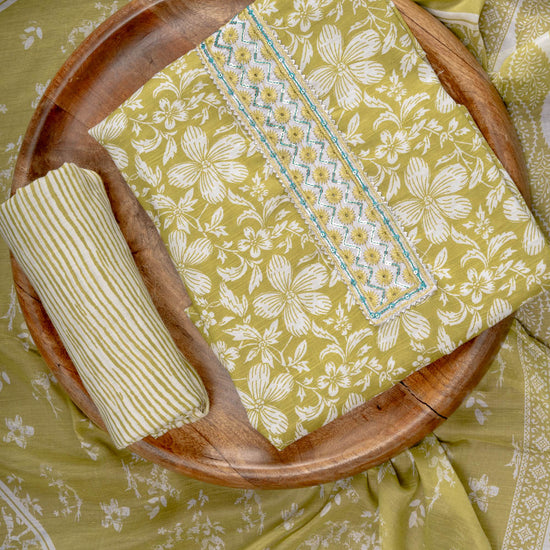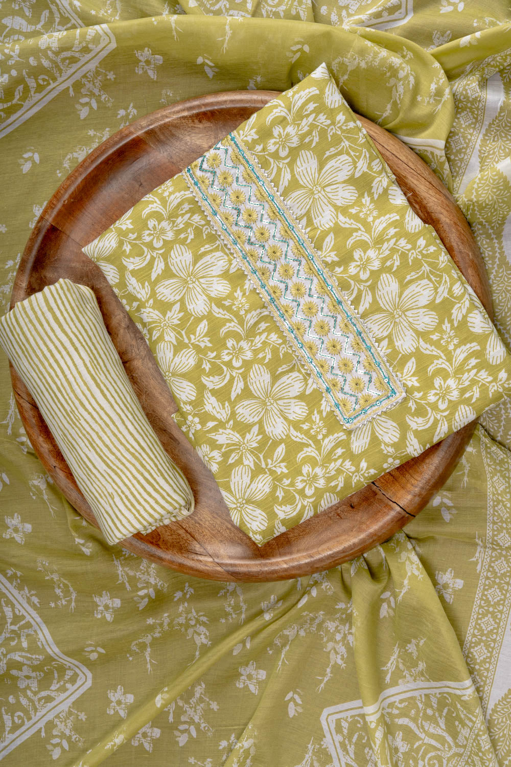 Panna Pista Sequence, Threadwork & Floral Printed Cotton Unstitched Salwar Suit With Cotton Dupatta