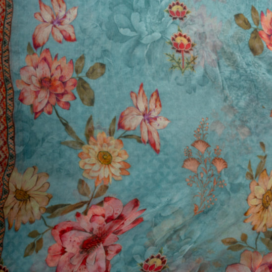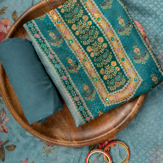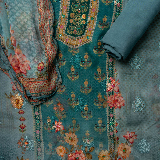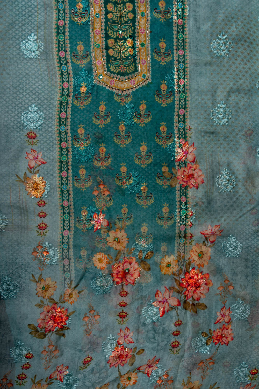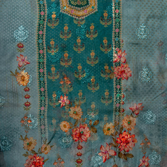 Panna Sky Blue Cutdana, Mirror Sheet, Threadwork & Floral Printed Organza Unstitched Salwar Suit With Chiffon Dupatta
