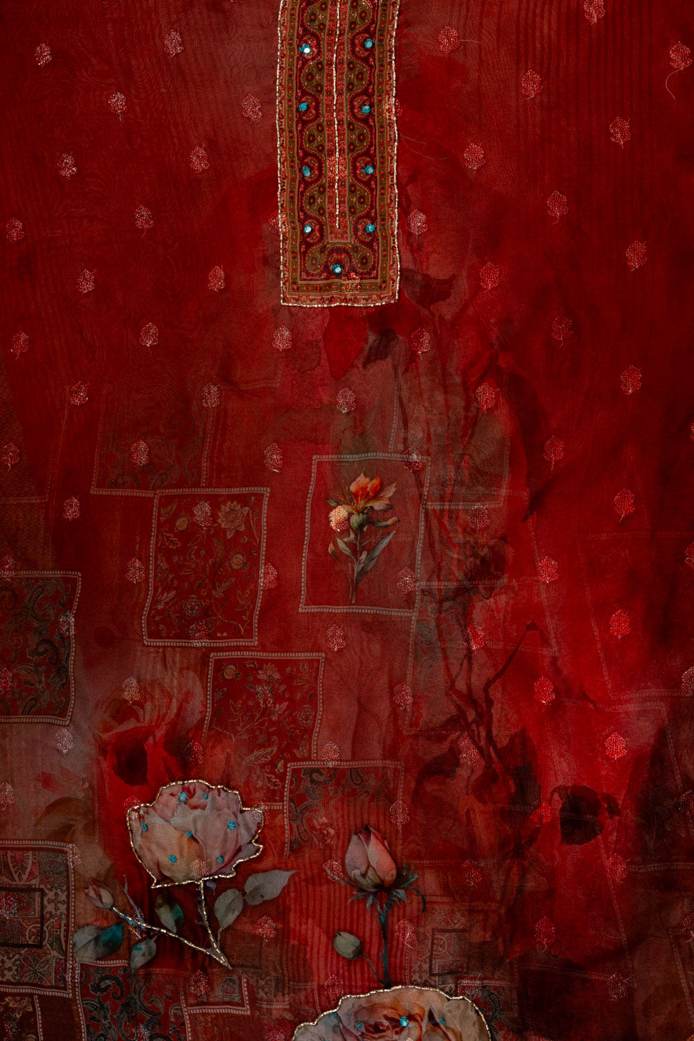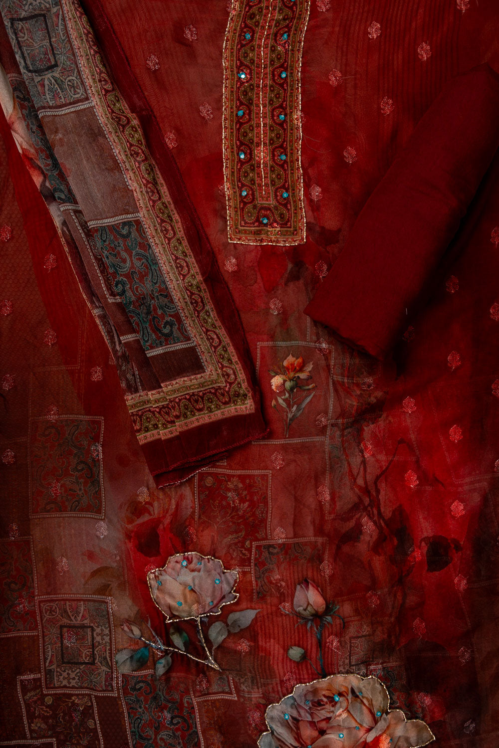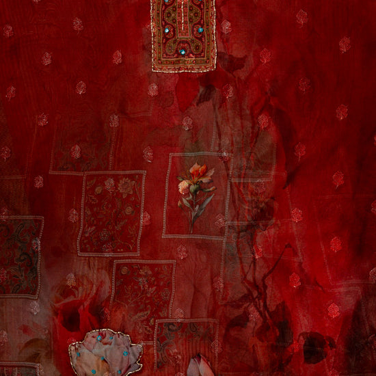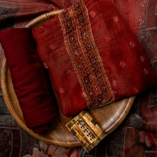 Panna Maroon Cutdana, Mirror Sheet, Threadwork & Digital Printed Organza Unstitched Salwar Suit With Chiffon Dupatta