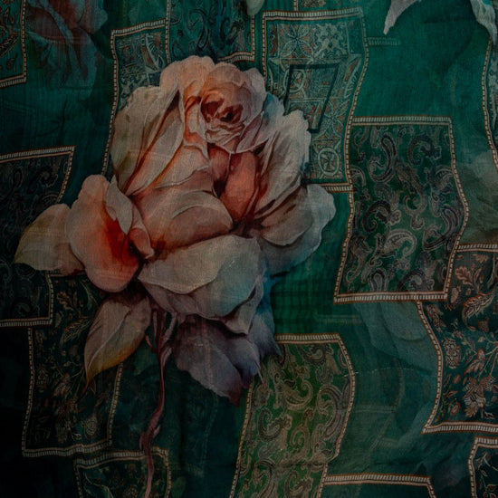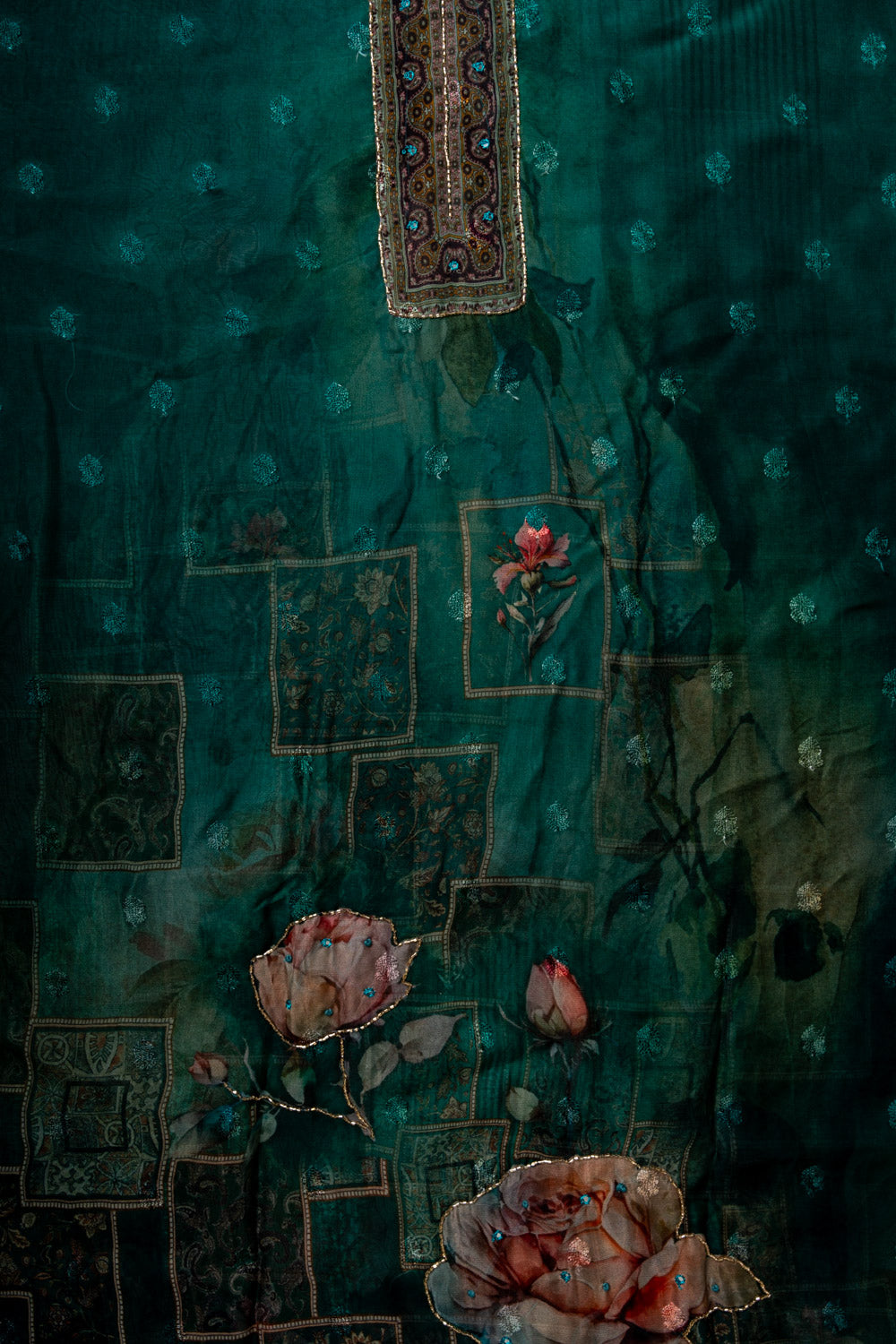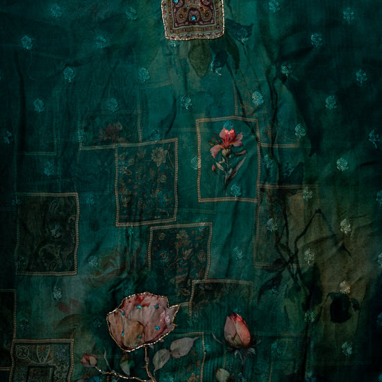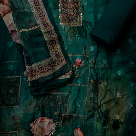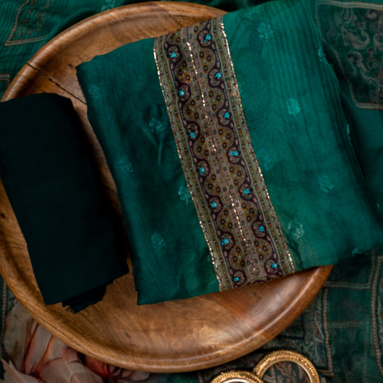 Panna Rama Cutdana, Mirror Sheet, Threadwork & Digital Printed Organza Unstitched Salwar Suit With Chiffon Dupatta