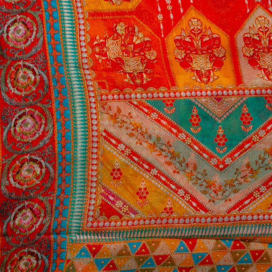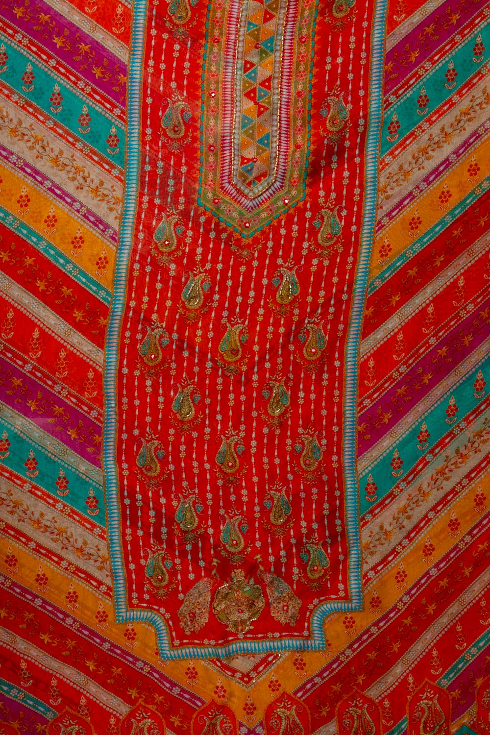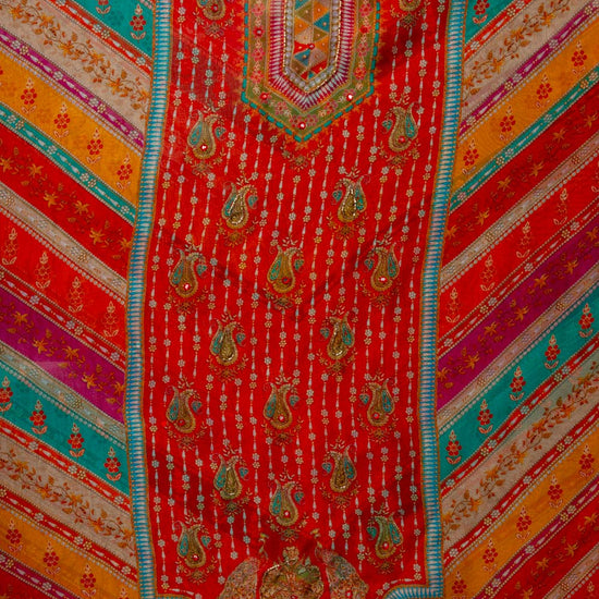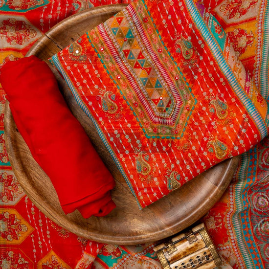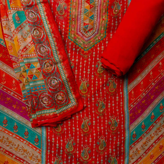 Panna Red Cutdana, Mirror Sheet, Threadwork & Floral Printed Organza Unstitched Salwar Suit With Chiffon Dupatta