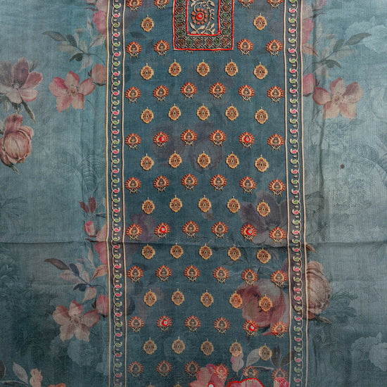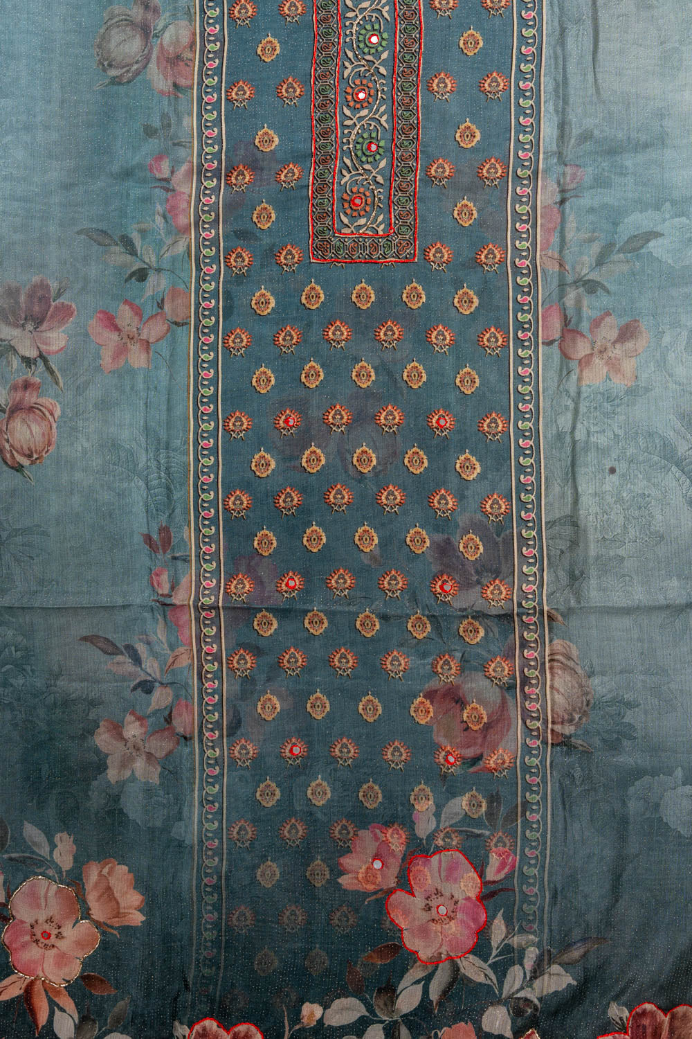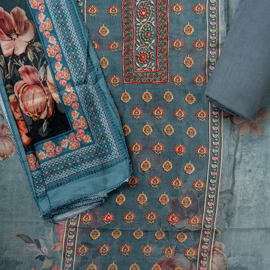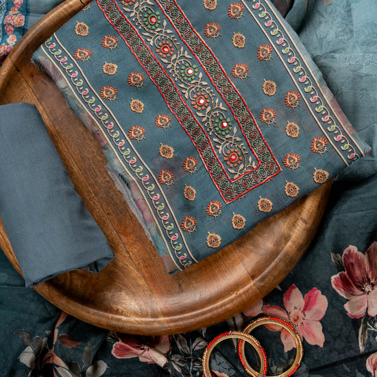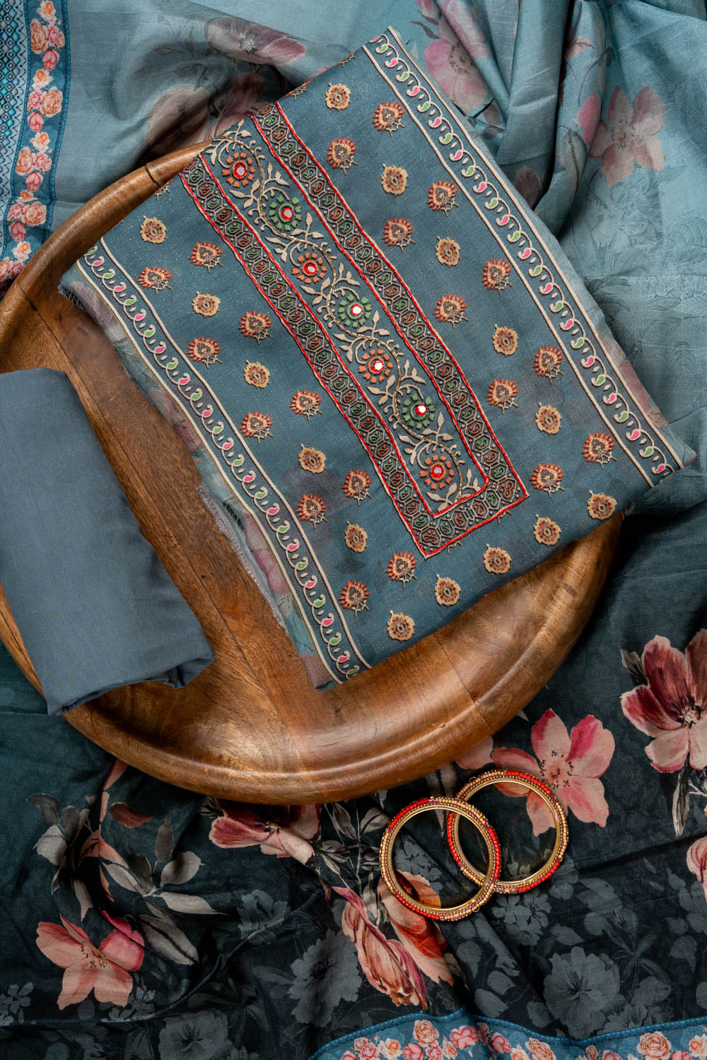 Panna Grey Cutdana, Mirror Sheet, Threadwork & Digital Printed Muslin Unstitched Salwar Suit With Muslin Cotton Dupatta