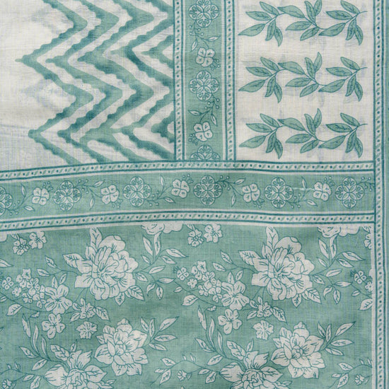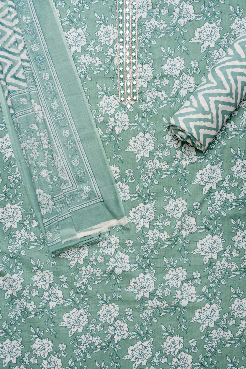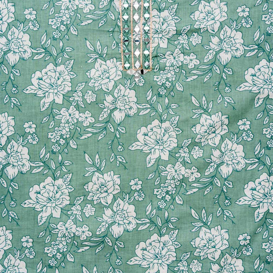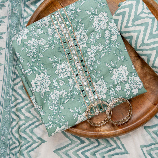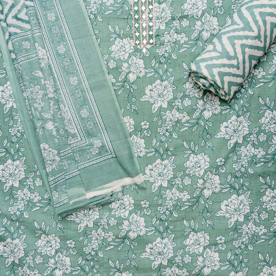 Panna Mint Green Mirror, Threadwork & Floral Printed Cotton Unstitched Salwar Suit With Cotton Dupatta