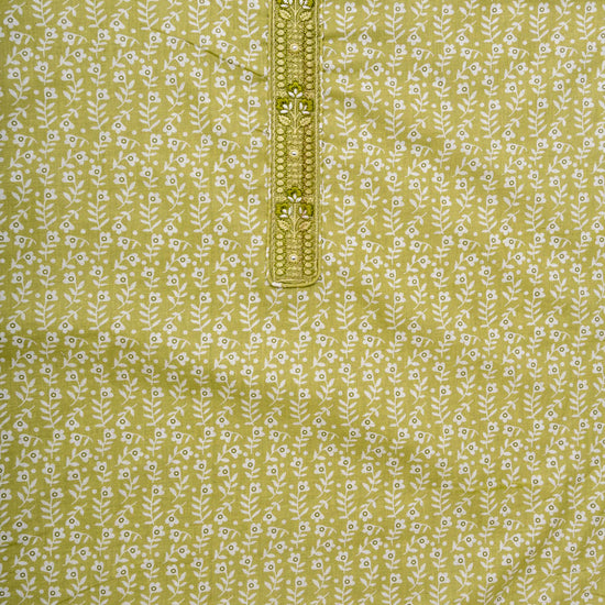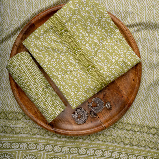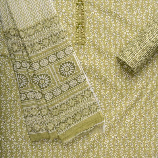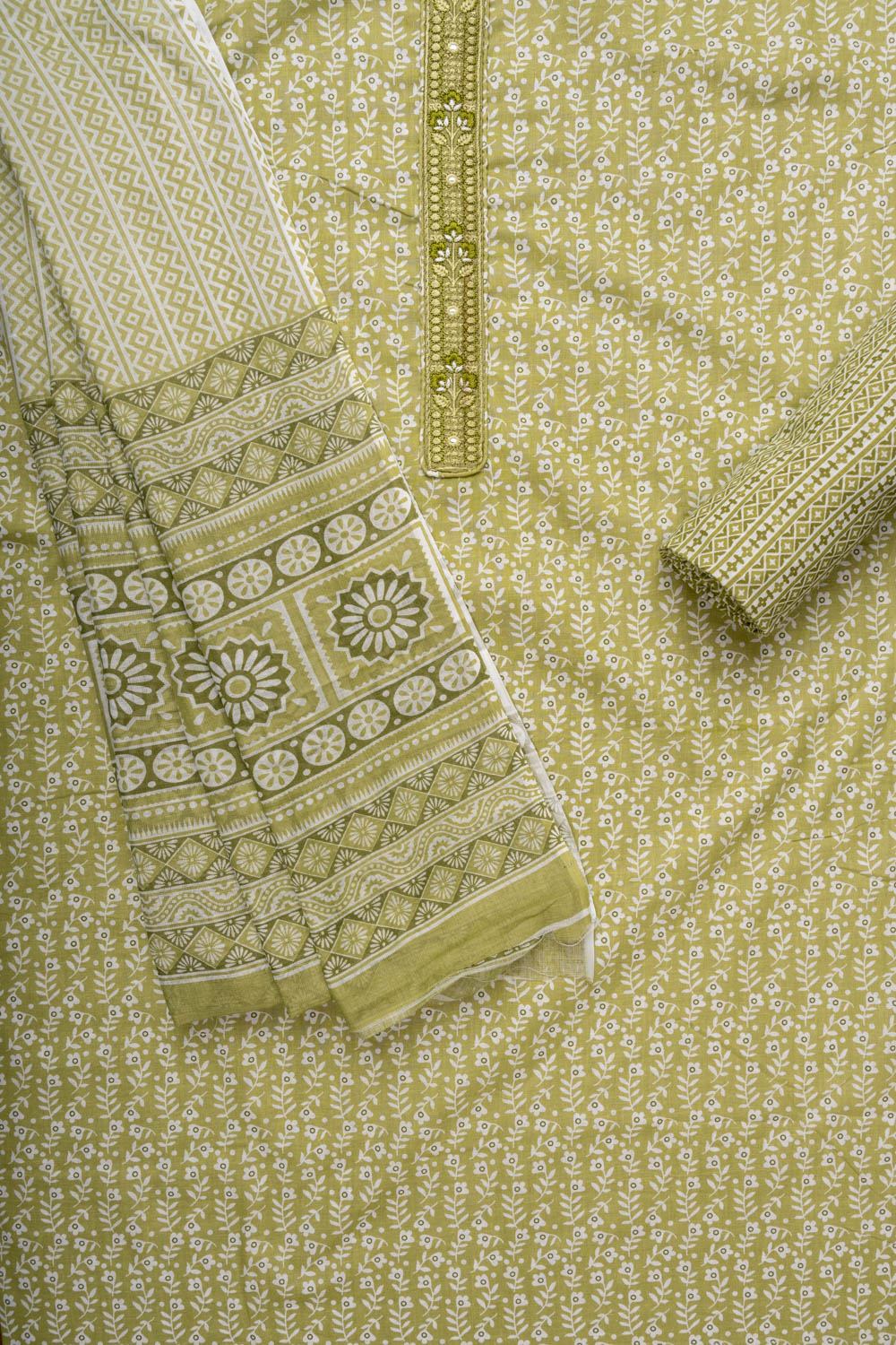 Panna Pista Threadwork & Floral Printed Cotton Unstitched Salwar Suit With Cotton Dupatta
