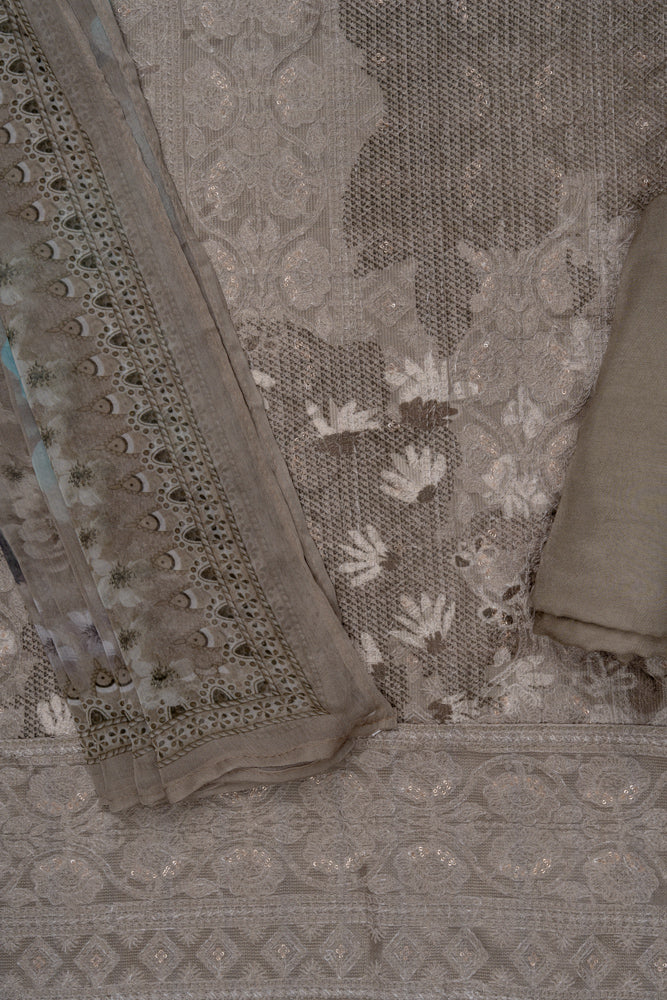 Chikoo Sequence, Threadwork & Floral Printed Georgette Unstitched Salwar Suit With Georgette Dupatta