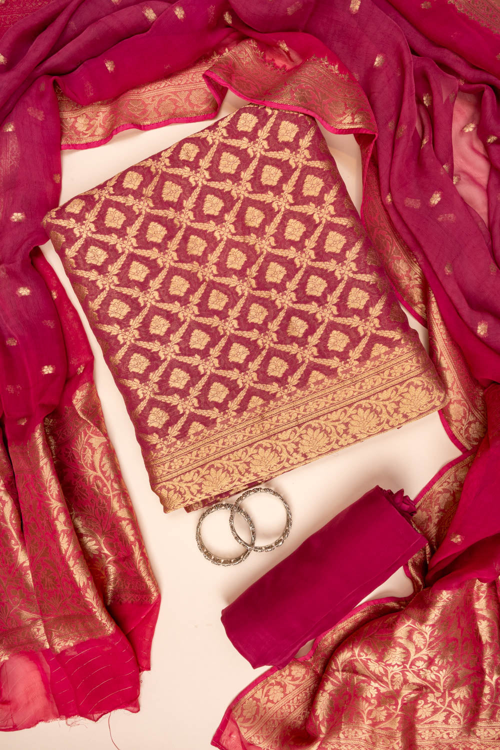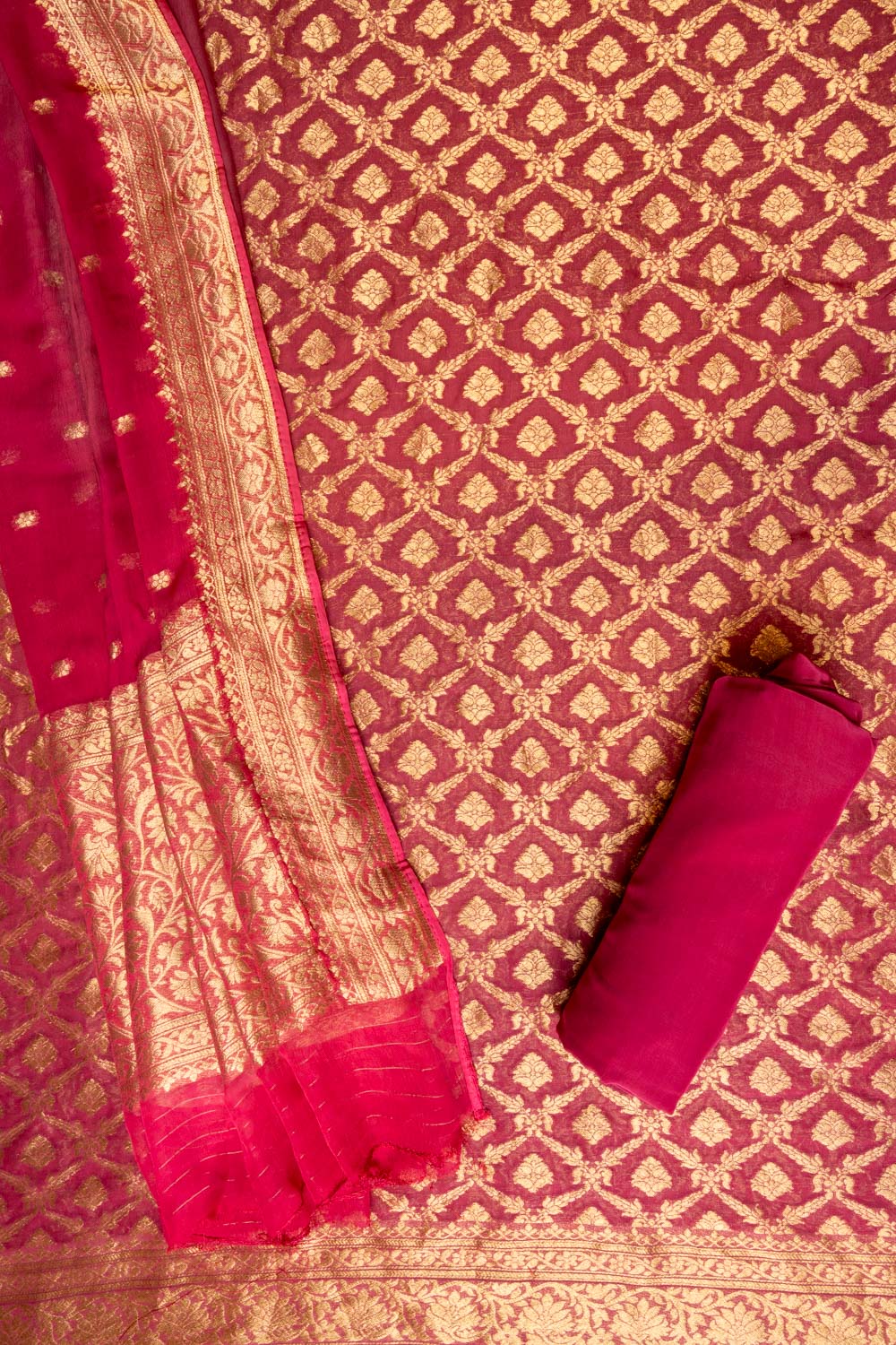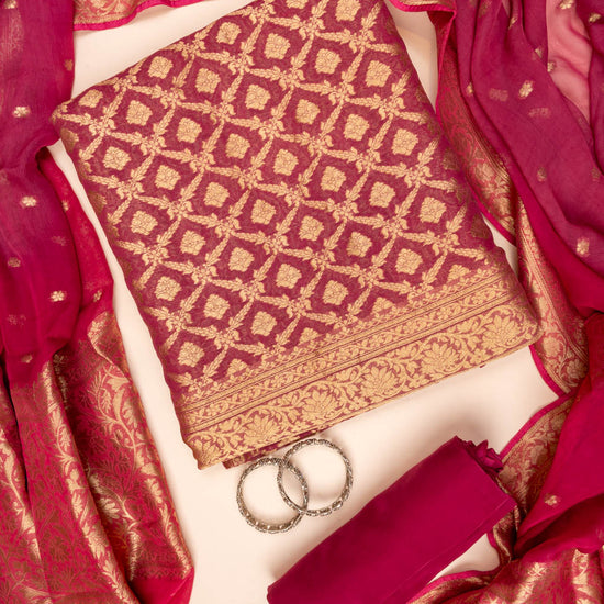 Onion Banarasi Woven Zari Khaddi Georgette Unstitched Salwar Suit With Georgette dupatta