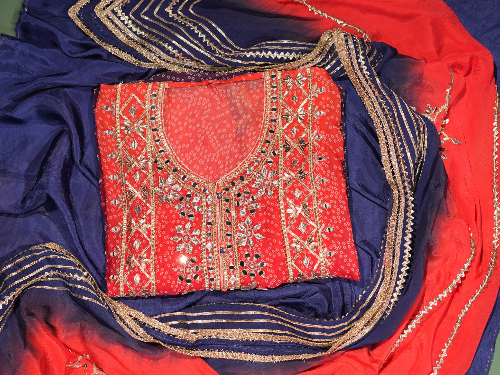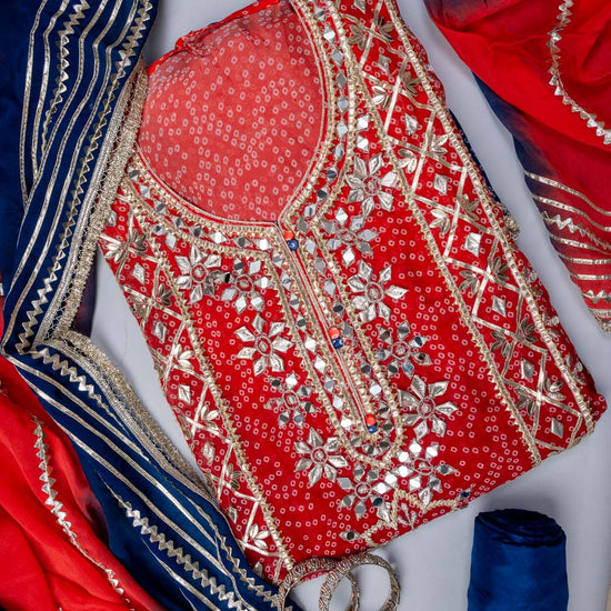 Red Gotta Patti, Mirror, Zarkan & Bandhini Printed Organza Unstitched Salwar Suit With Crepe Dupatta
