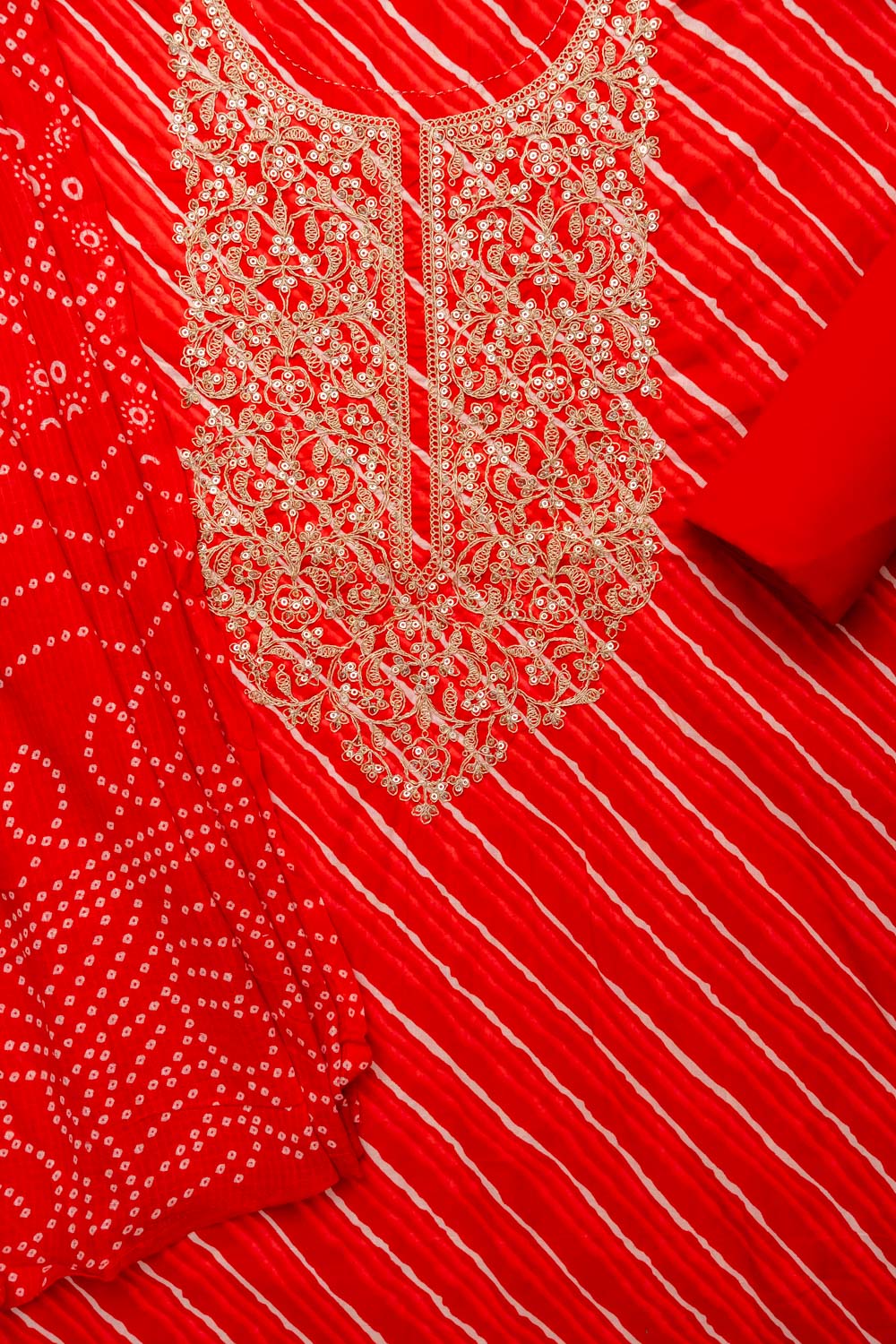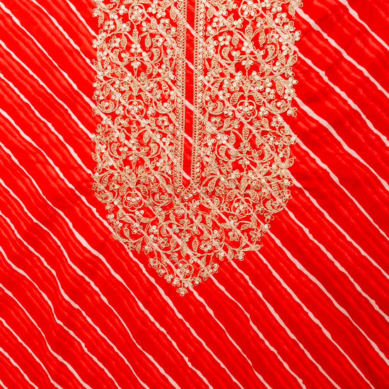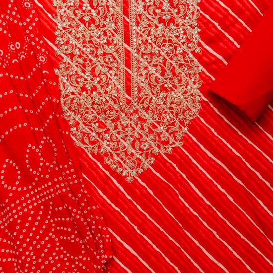 The suit features a classic Lehriya print, known for its vibrant waves of color and traditional charm. Accentuated with delicate zari thread embroidery and subtle sequin highlights, this ensemble radiates understated sparkle and refined craftsmanship.