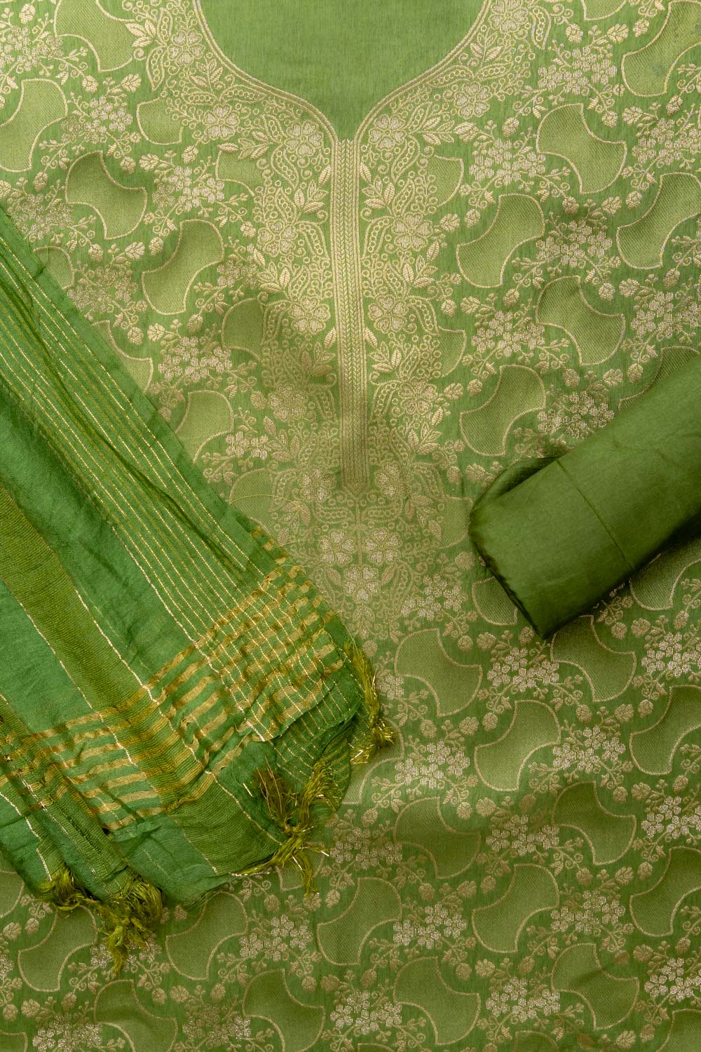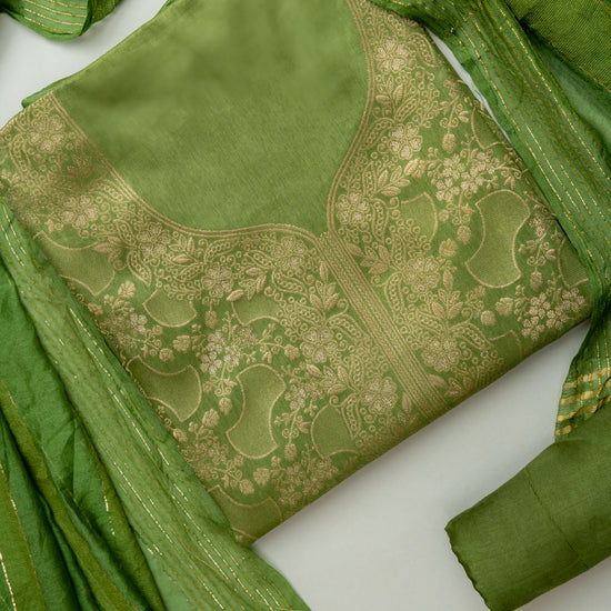 The suit is enhanced with intricate woven zari patterns, adding a subtle touch of shimmer and sophistication. The delicate zari motifs reflect skilled craftsmanship, making this ensemble a versatile choice for women who love classic ethnic wear with understated elegance.