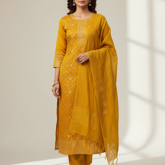 The suit is enhanced with intricate woven zari patterns, adding a subtle touch of shimmer and sophistication. The delicate zari motifs reflect skilled craftsmanship, making this ensemble a versatile choice for women who love classic ethnic wear with understated elegance.