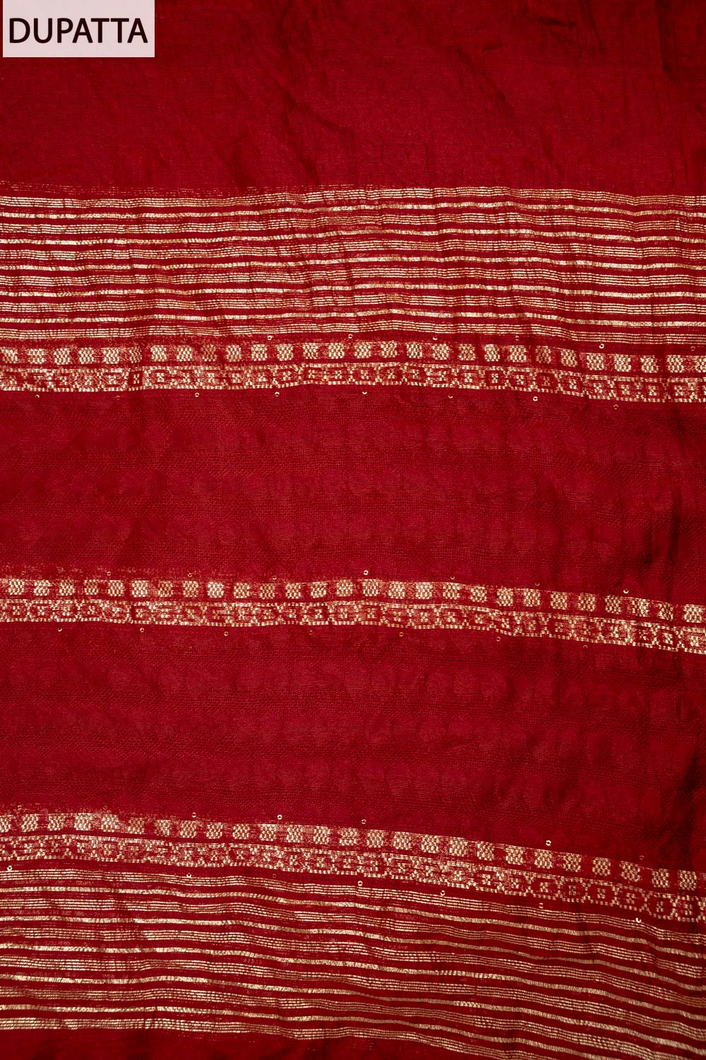 The suit features classic Bandhani prints that celebrate timeless artistry, beautifully enhanced with delicate Sequence highlights, fine Thread embroidery, and rich Zari thread work for a subtle festive shimmer.