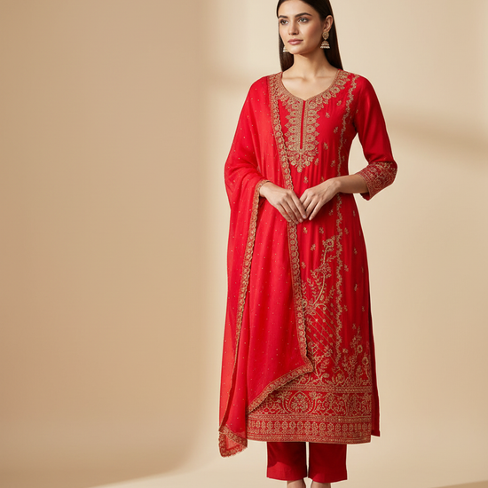 Redefine elegance with this stunning Crepe Unstitched Suit Set, crafted to bring together timeless tradition and contemporary charm. The soft, flowy crepe fabric offers a refined drape and effortless comfort, making it perfect for festive and occasion wear.