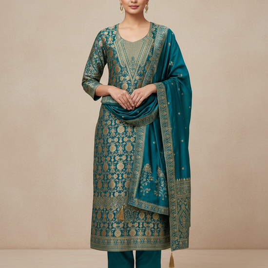 Panna Mesmerizing Charm Dark Firozi Shimmer Unstitched Salwar Kameez With Cotton Dupatta