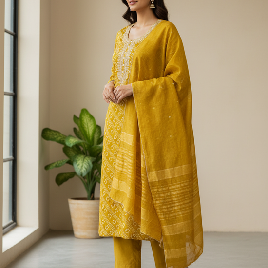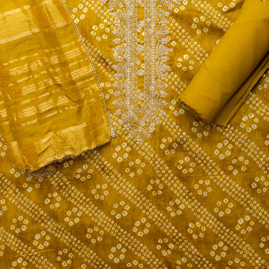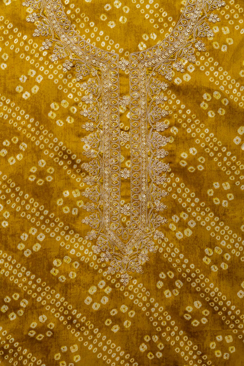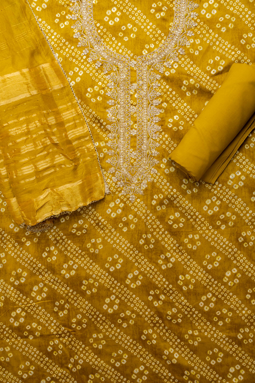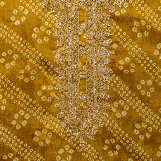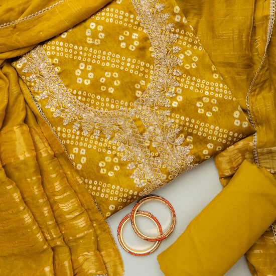 The suit showcases a vibrant Bandhani print, enhanced with subtle sequin embellishments and delicate zari thread work that adds shimmer and sophistication. The combination of classic print and intricate embroidery makes this ensemble a versatile choice for both casual and festive occasions.