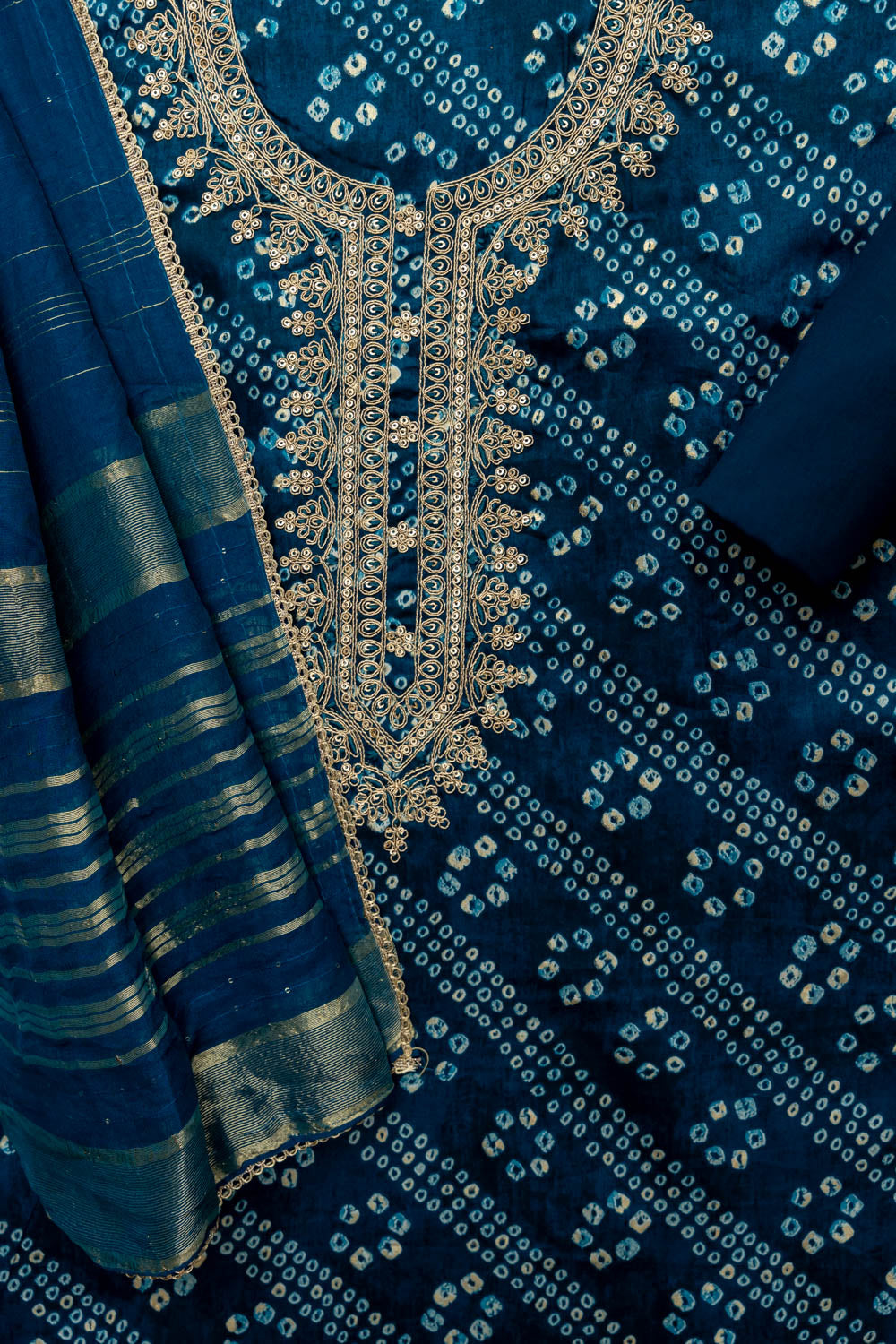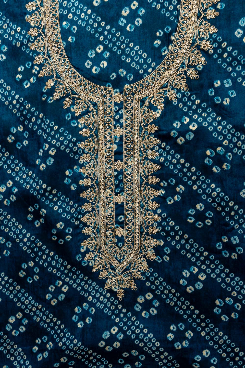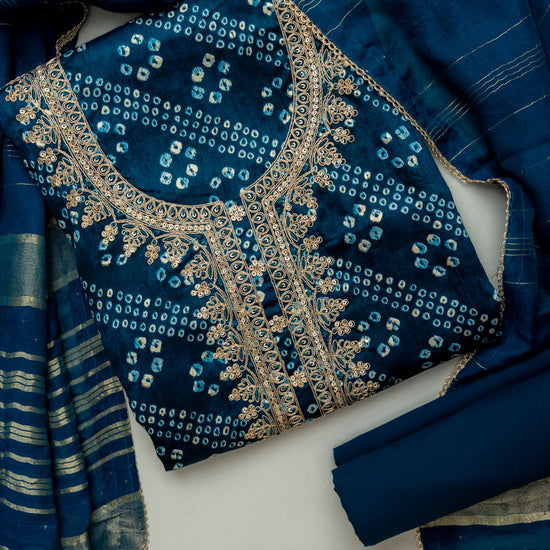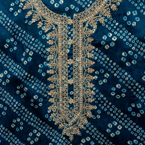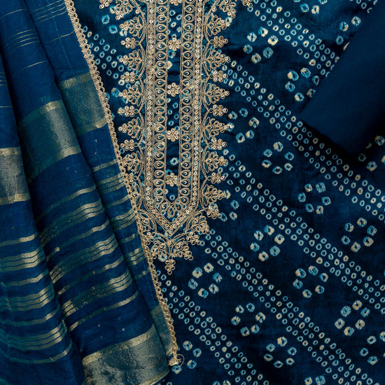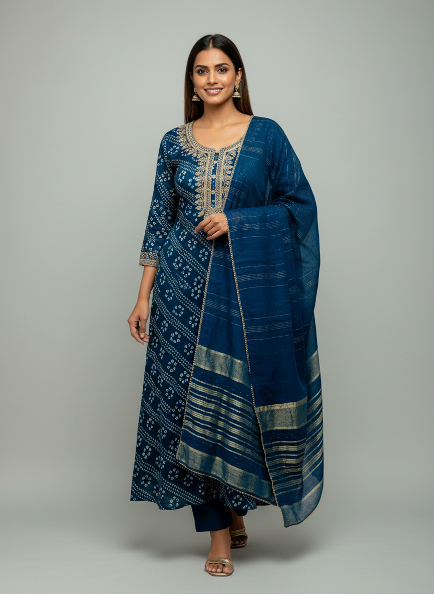 The suit showcases a vibrant Bandhani print, enhanced with subtle sequin embellishments and delicate zari thread work that adds shimmer and sophistication. The combination of classic print and intricate embroidery makes this ensemble a versatile choice for both casual and festive occasions.