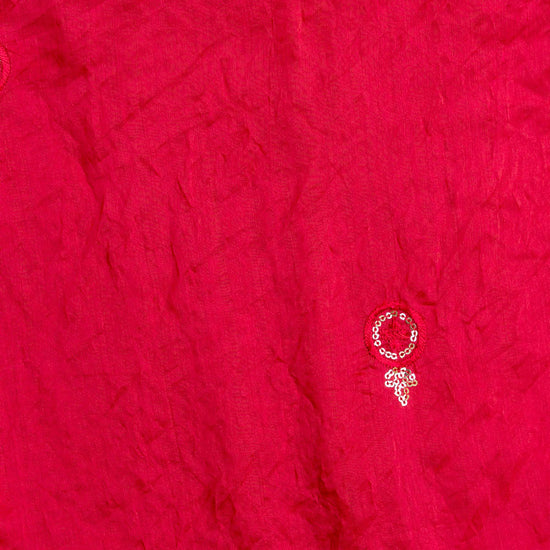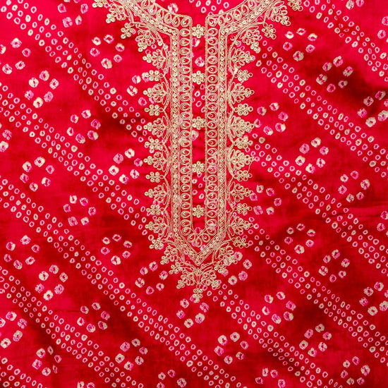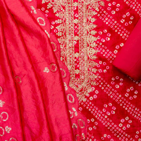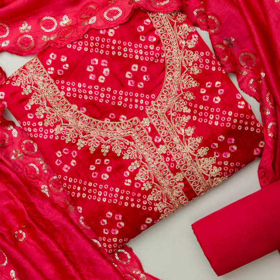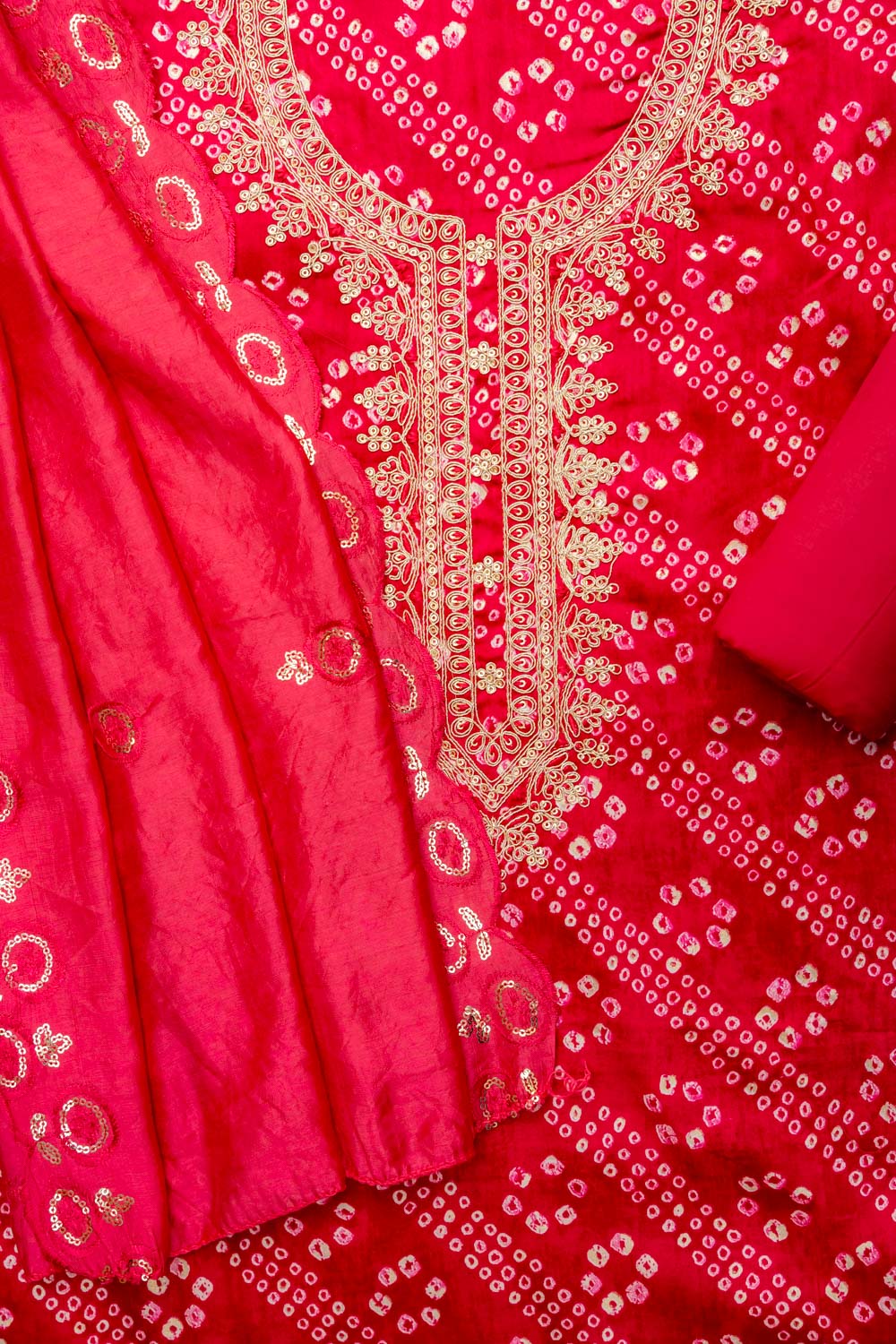 The suit showcases a vibrant Bandhani print, enhanced with subtle sequin embellishments and delicate zari thread work that adds shimmer and sophistication. The combination of classic print and intricate embroidery makes this ensemble a versatile choice for both casual and festive occasions.