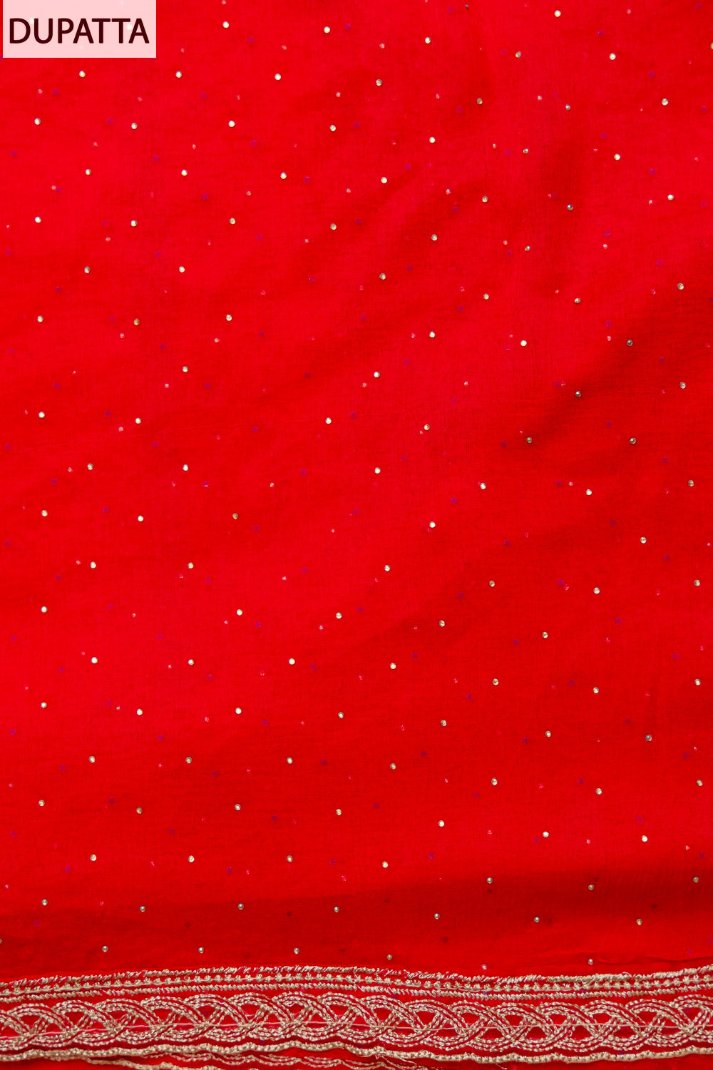 The ensemble is beautifully embellished with rich zari thread embroidery, fine resham thread work, and glimmering zarkan accents that add a touch of luxe sparkle. Each motif is thoughtfully designed, creating a graceful balance of shine and sophistication.